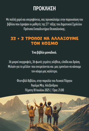 09 Ιουλίου 2025Γράψαμε βιβλίο! Οι μαθητές μας της Στ΄ τάξης έγιναν συγγραφείς και παρουσιάζουν το αποτέλεσμα της προσπάθειας τους με τίτλο «33 + 3 τρόποι να αλλάξουμε τον κόσμο» στο πλαίσιο του Φεστιβάλ Βιβλίου Θεσσαλονίκης. Σας περιμένουμε όλους!