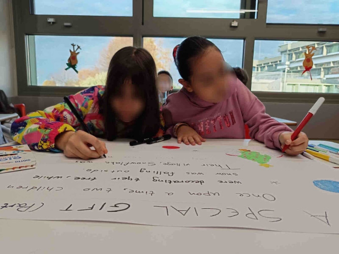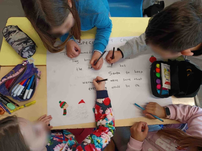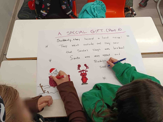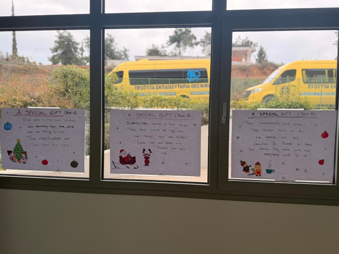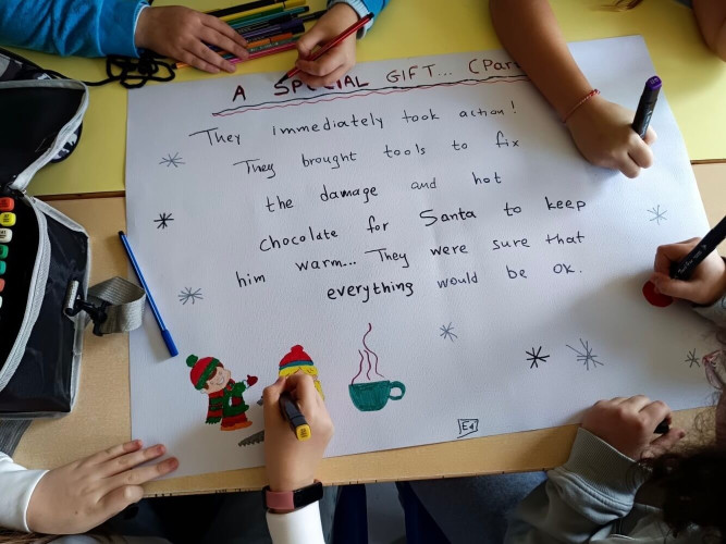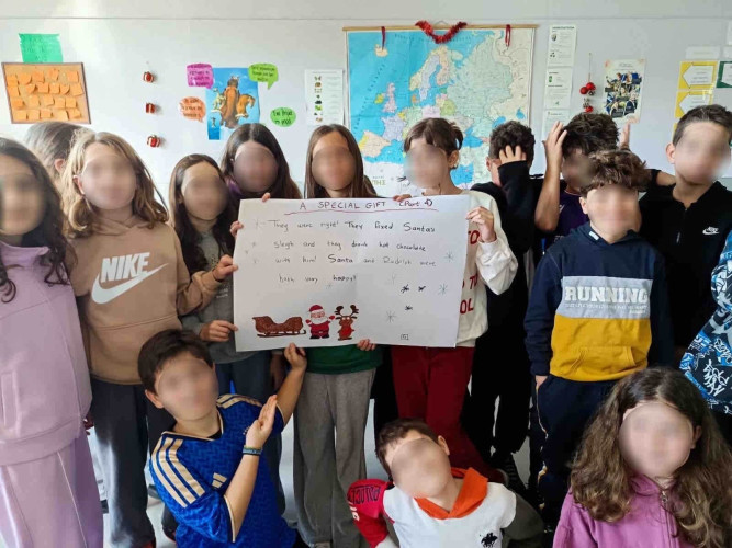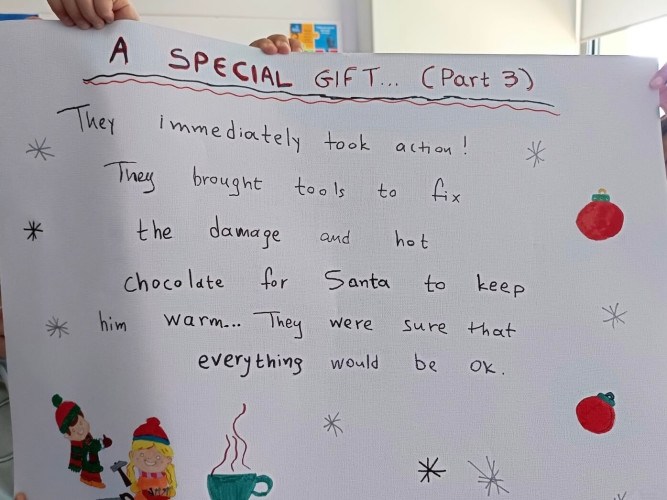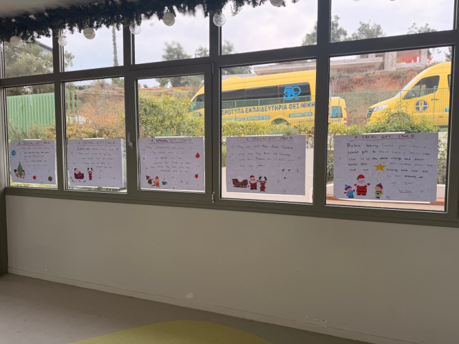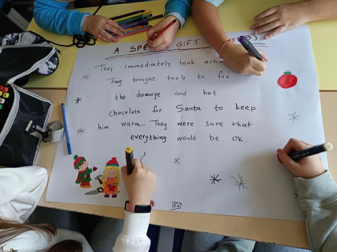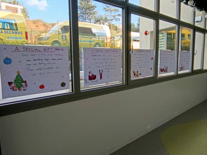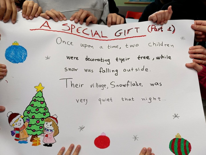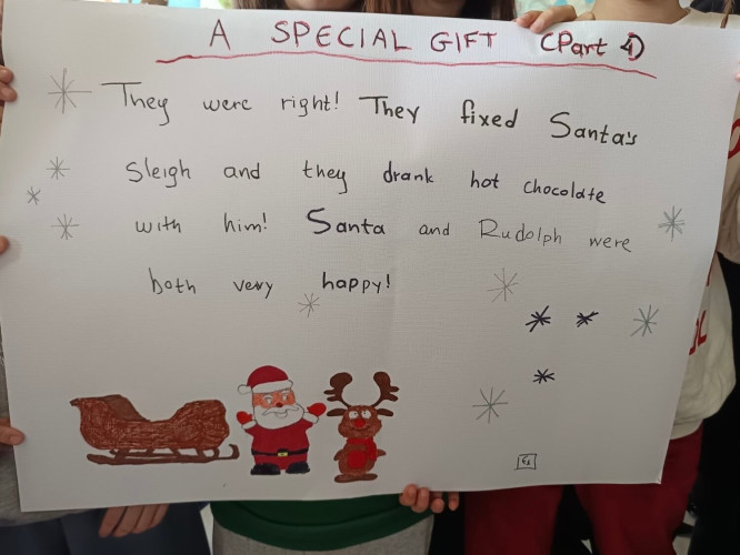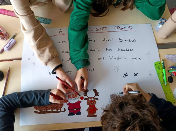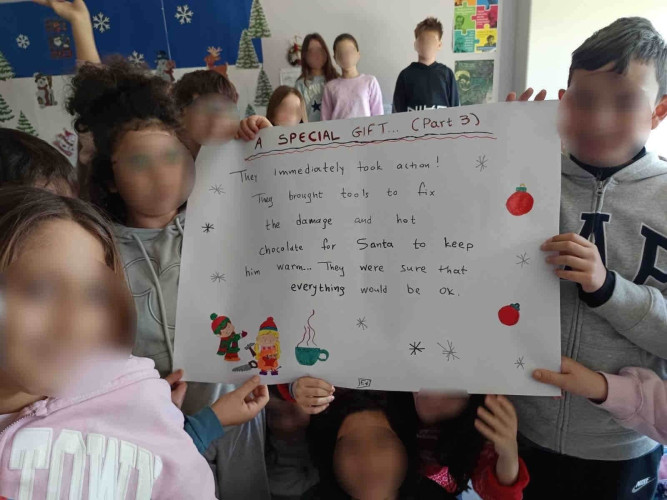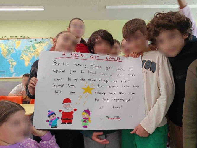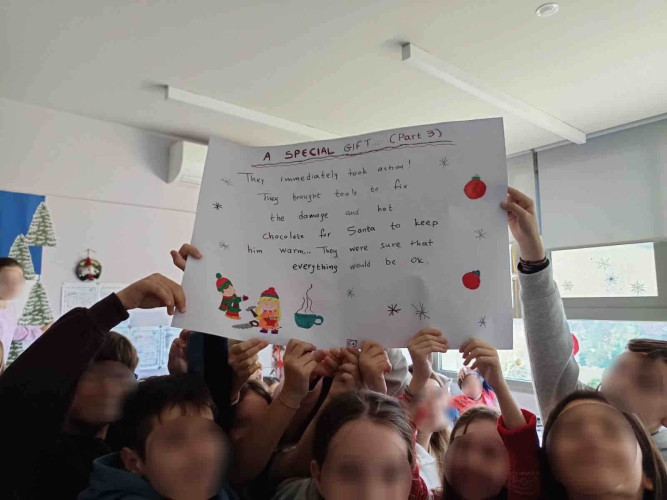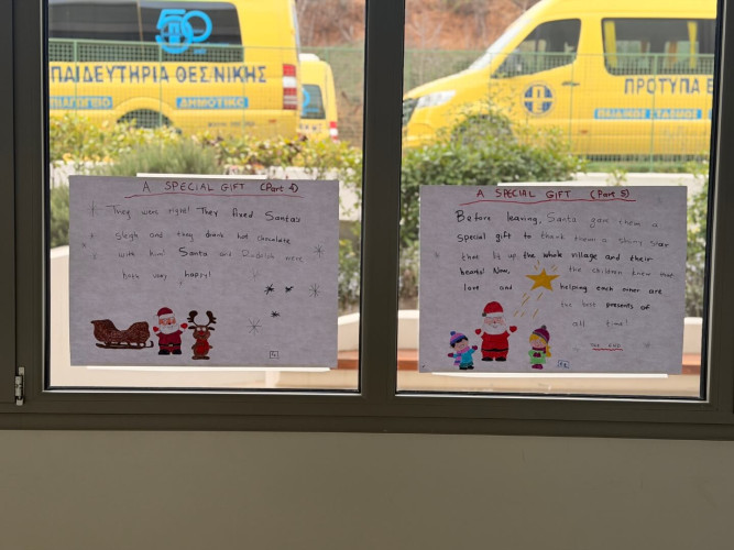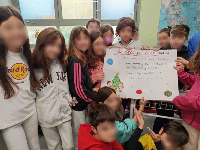 29 Δεκεμβρίου 2025Μια εικονογραφημένη ιστορία με τον τίτλο "Α special gift" δημιούργησαν οι μαθητές της Ε΄ τάξης στο μάθημα των αγγλικών. Τι συνέβη στον Άγιο Βασίλη και ήταν στενοχωρημένος; Πώς τον βοήθησαν τα παιδιά ενός χιονισμένου χωριού; Ποιο ιδιαίτερο δώρο τους έδωσε εκείνος πριν φύγει; Η ιστορία του χριστουγεννιάτικου project ήταν μία, χωρισμένη σε πέντε μέρη . Το κάθε τμήμα έγραψε και ζωγράφισε το δικό του κομμάτι και το επόμενο τμήμα συνέχισε την εξιστόρηση. Έτσι, όλα τα παιδιά συμμετείχαν ακριβώς στην ίδια εργασία διευρύνοντας την έννοια της συνεργασίας. Η πλοκή ολοκληρώθηκε και το μήνυμα αυτής είναι πως τα τα πραγματικά δώρα στη ζωή μας είναι η αγάπη, η ευγνωμοσύνη και η αλληλοβοήθεια. Happy New Year!