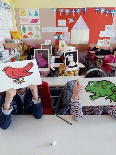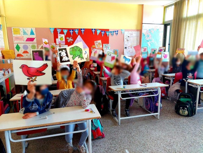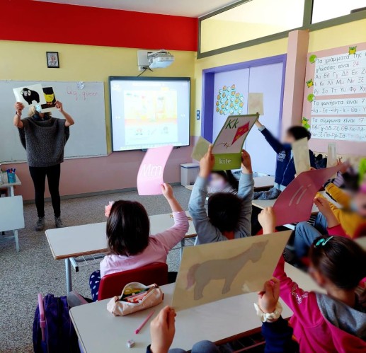 Επίσης, παρατήρησαν κάρτες με γράμματα του αγγλικού αλφάβητου και με ζωάκια, τις οποίες στη συνέχεια περιεργάστηκαν και σήκωσαν ψηλά, ανάλογα με την οδηγία που είχαν κάθε φορά από τη δασκάλα τους