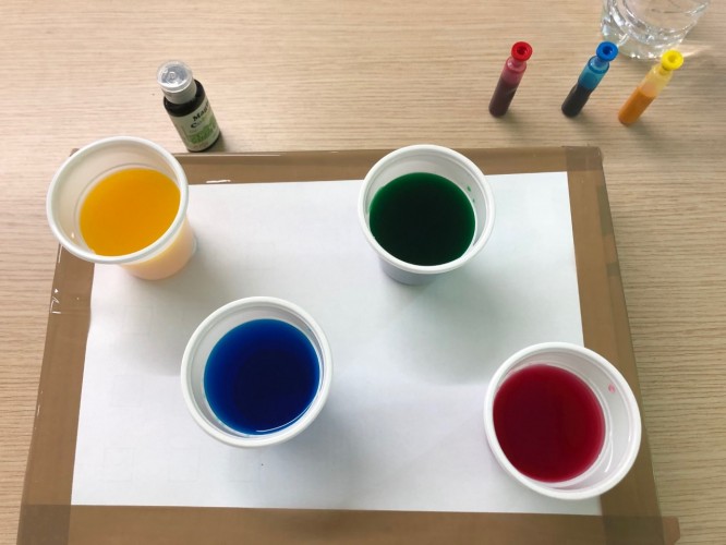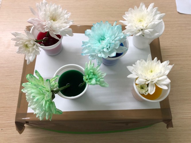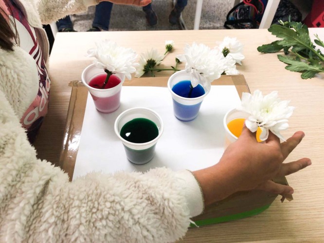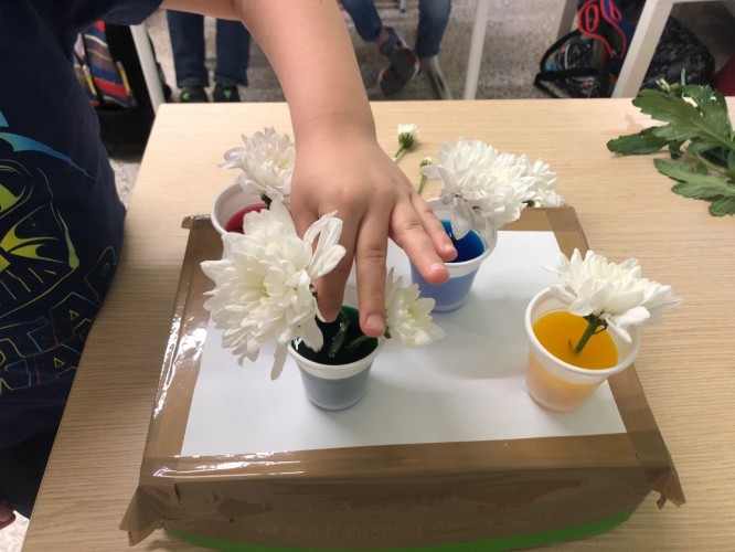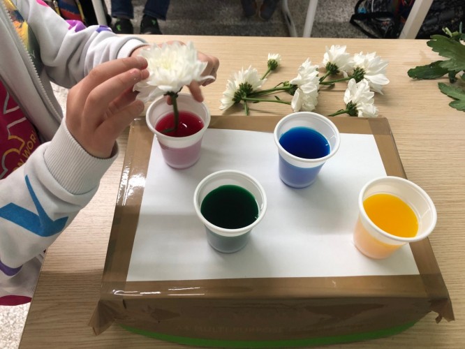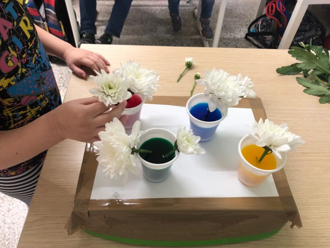 Επιπλέον, οι μικροί μας ερευνητές, πραγματοποίησαν ένα πείραμα για την καλύτερη κατανόηση των φυτών. Χρησιμοποίησαν χρώματα ζαχαροπλαστικής στο νερό για να παρατηρήσουν τις επιπτώσεις που έχει η βαφή στα λουλούδια. Αφού τοποθέτησαν λευκά λουλούδια μέσα σε χρωματισμένο νερό, μετά από λίγες μέρες, τα λευκά άνθη πήραν το χρώμα της βαφής. Οι μαθητές μας αντιλήφθηκαν πως όσο περισσότερο παραμένουν τα λουλούδια στο νερό, τόσο πιο σκούρα γίνονται τα πέταλά τους.
