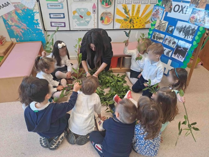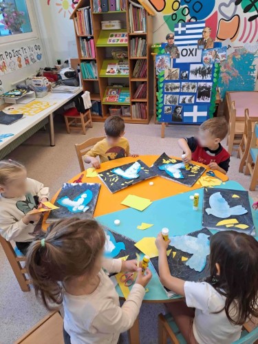 25 Οκτωβρίου 2024«Ζήτω η Ειρήνη», φώναξαν ζωηρά τα προνηπιάκια μας και γιόρτασαν με κάθε τιμή την επέτειο της 28ης Οκτωβρίου. Με σεβασμό και αφοσίωση άκουσαν προσεκτικά τα γεγονότα της εποχής και διάβασαν ιστορίες, επικεντρώνοντας το ενδιαφέρον τους στην αξία της ειρήνης μεταξύ των εθνών. Ασχολήθηκαν ιδιαίτερα με το εθνικό μας έμβλημα, την ελληνική σημαία και τους συμβολισμούς της. Έπαιξαν ψυχοκινητικά παιχνίδια για την ειρήνη και τον πόλεμο, έννοιες που απέδωσαν και εικαστικά στην ομαδική εργασία που δημιούργησαν ενώ η εορταστική εβδομάδα ολοκληρώθηκε με την κατάθεση στεφάνου στο ηρώο της περιοχής και την παρέλαση στην αυλή μας, συνοδεία του εθνικού μας ύμνου.