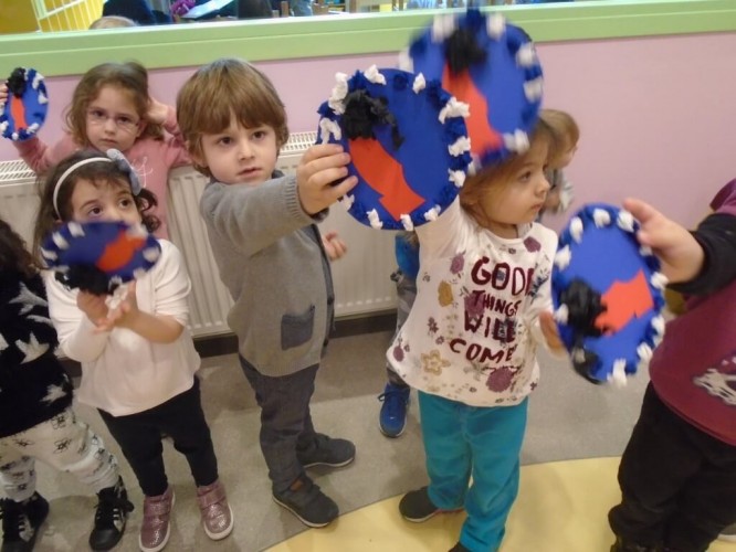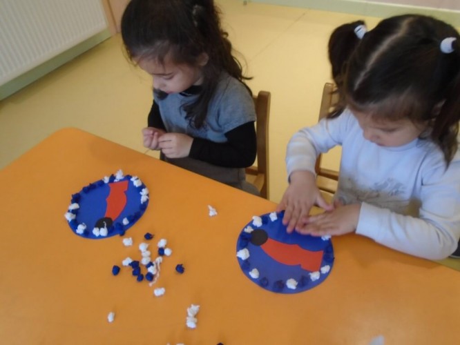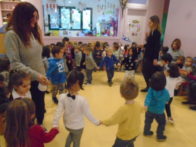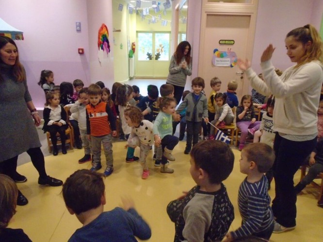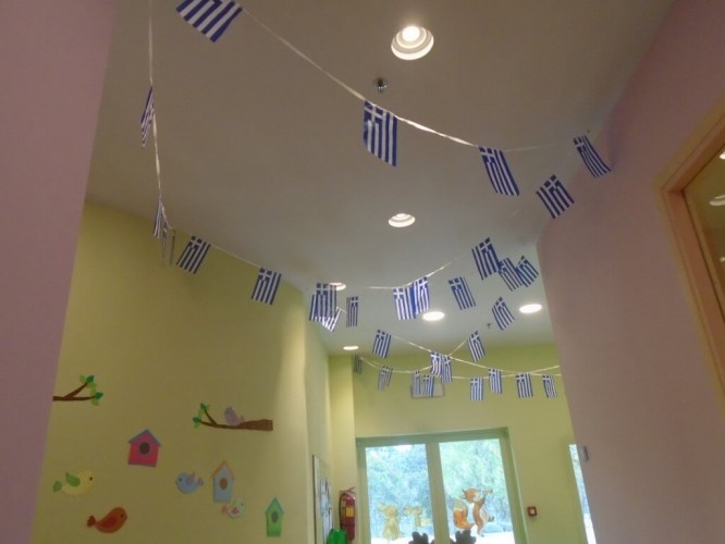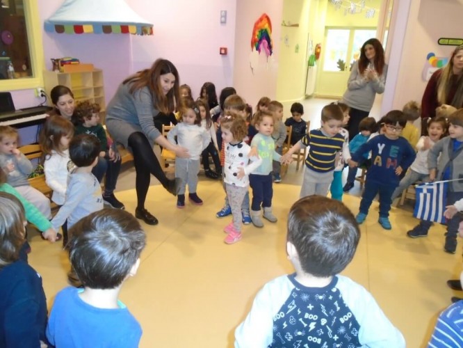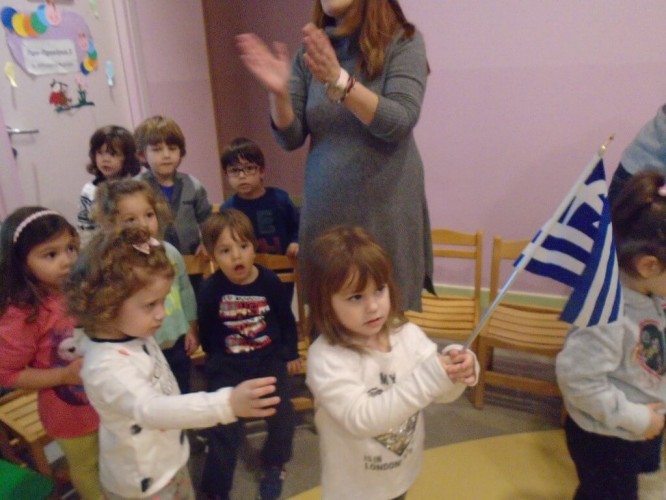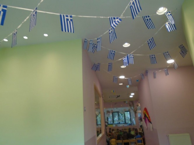 Αφού σημαιοστολίσαμε τον Παιδικό Σταθμό με γαλανόλευκα σημαιάκια, όλοι οι μαθητές μαζεύτηκαν στη σάλα. Μιλήσαμε για τη διπλή γιορτή της 25ης Μαρτίου και με αφορμή έναν μαθητή των Προ-προνηπίων, ο οποίος ήρθε ντυμένος τσολιαδάκι συζητήσαμε για την ενδυμασία των Ελλήνων του 1821.