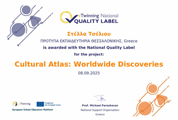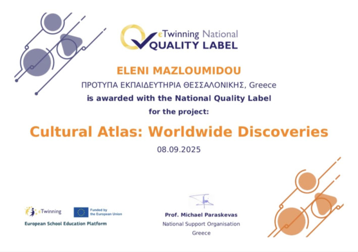 12 Σεπτεμβρίου 2025Στo πλαίσιo του ευρωπαϊκού προγράμματος συνεργασίας e twinning "Cultural Atlas: Worldwide Discoveries" το Νηπιαγωγείο μας διακρίθηκε αποσπώντας την Εθνική Ετικέτα Ποιότητας. Οι μαθητές μας μαζί με τις εκπαιδευτικούς τους εργάστηκαν σε όλη τη διάρκεια της περσινής χρονιάς με στόχο να κατανοήσουν την παγκόσμια ποικιλομορφία. Συνεργάστηκαν με σχολεία του εξωτερικού εξ αποστάσεως και έμαθαν τις παραδόσεις και τον τρόπο ζωής διαφορετικών πολιτισμών. Μπράβο σε όλους για την προσπάθειά τους. Συγχαρητήρια!