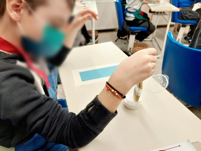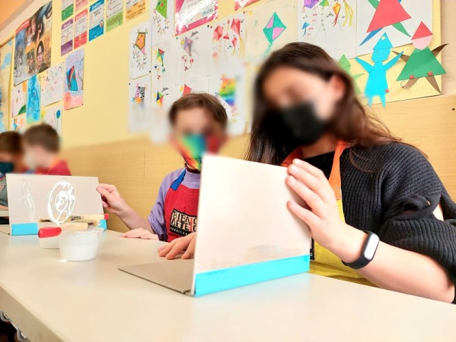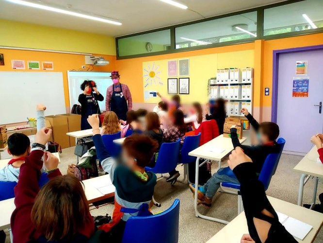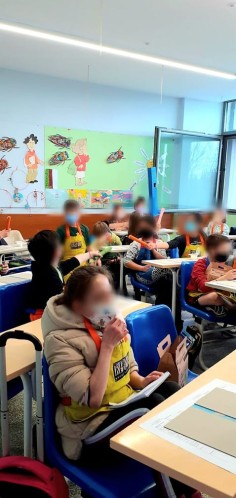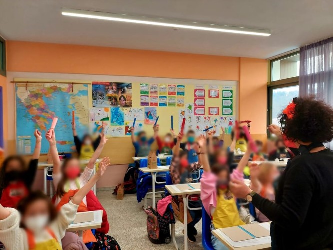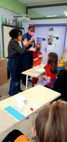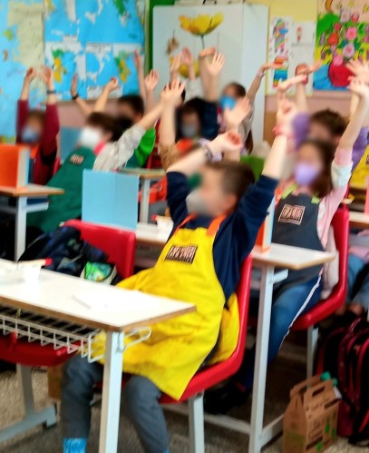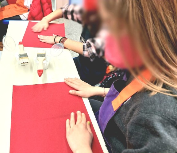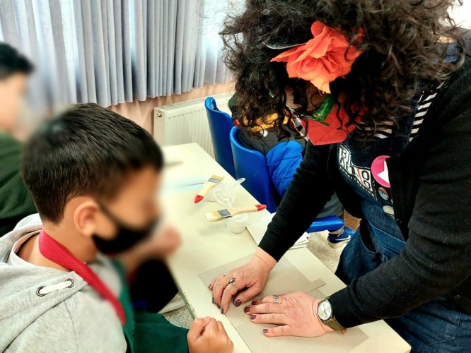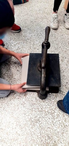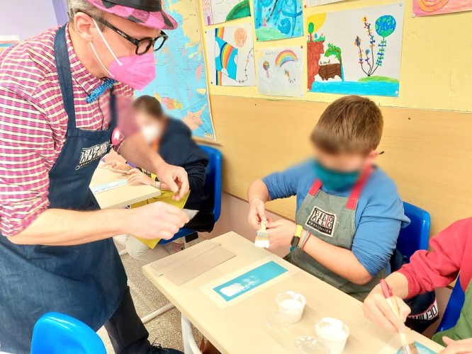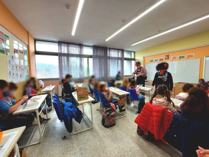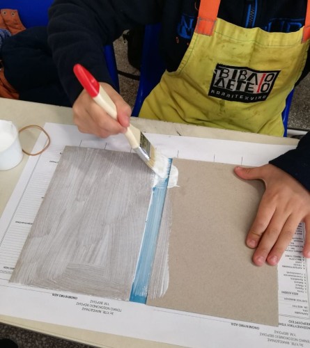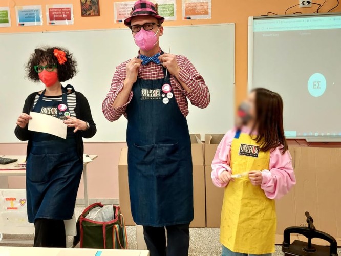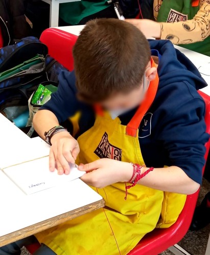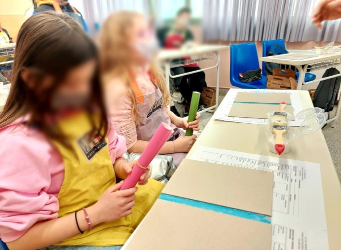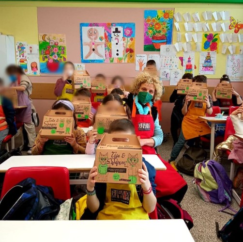 18 Μαρτίου 2022Τι κοινό μπορεί να έχουν τα παιδιά μας της Δ’ Τάξης και οι δύο γάτοι; Την αγάπη για το βιβλίο! Αλλά, καλά τα βιβλία και ενδιαφέροντα τα όσα γράφουν, όμως, πώς φτιάχνονται και ποια είναι η διαδικασία συντήρησής τους από τη φθορά του χρόνου; Η Τέλα μια φοβερή γάτα που ξέρει τα πάντα για τη βιβλιοδεσία και ο Σπάγκος ο φασαριόζος κεραμιδόγατος από το ΒΙΒΛΙΟΔΕΤΕΙΟ ήρθαν στις τάξεις μας και μας μύησαν στην τέχνη της βιβλιοδεσίας. Βάλαμε και ποδιές και είχαμε ο καθένας το δικό του βαλιτσάκι με τα υλικά που χρειαζόμασταν. Αυτός ο κύριος Σπάγκος, πέρα από τα μυστικά του δεσίματος μας έκανε και πολλά αστεία, αλλά και η κυριά Τέλα, δεν πήγαινε πίσω. Γέμισε η τάξη γέλια, χρώματα και βιβλία! Όχι τα σχολικά, αυτά τα βάλαμε για λίγο κάτω από τα θρανίο, για να έχουμε χώρο να φτιάξουμε τα δικά μας! Την επόμενη σχολική χρονιά, μαμά, το «ντύσιμο» των βιβλίων θα το κάνουμε εμείς.