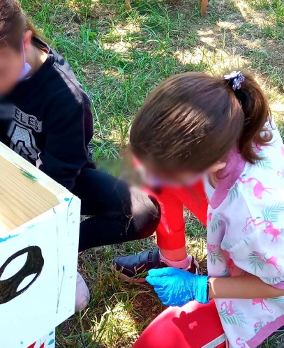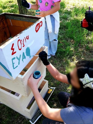 Τα παιδιά μας απηύθυναν τις ερωτήσεις τους στην κα. Τανακάκη και στη συνέχεια, υπό την εποπτεία του υπεύθυνου των κυψελών βγήκαν στο εξωτερικό χώρο του αγροκτήματος και παρατήρησαν τις μελισσούλες στο φυσικό τους περιβάλλον.