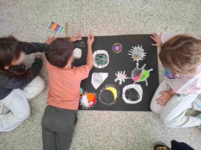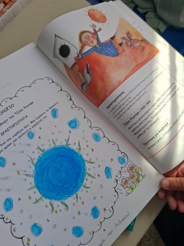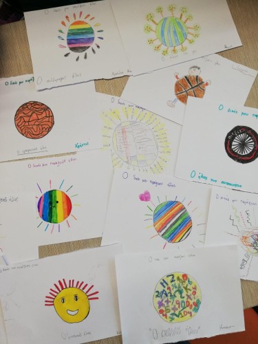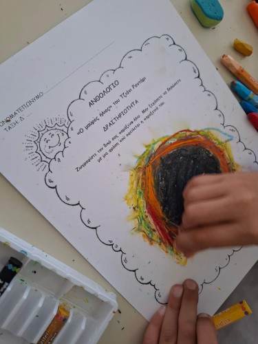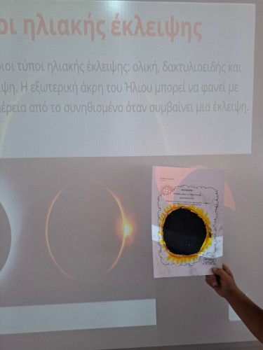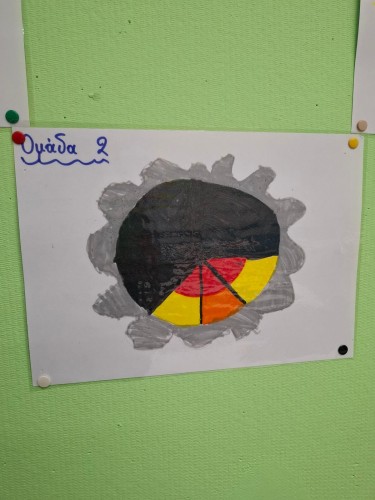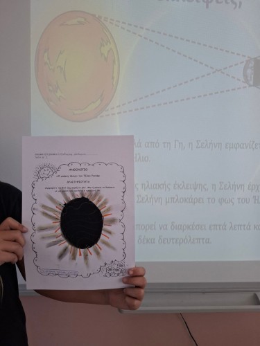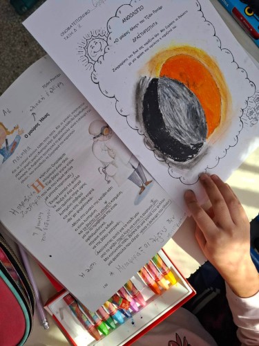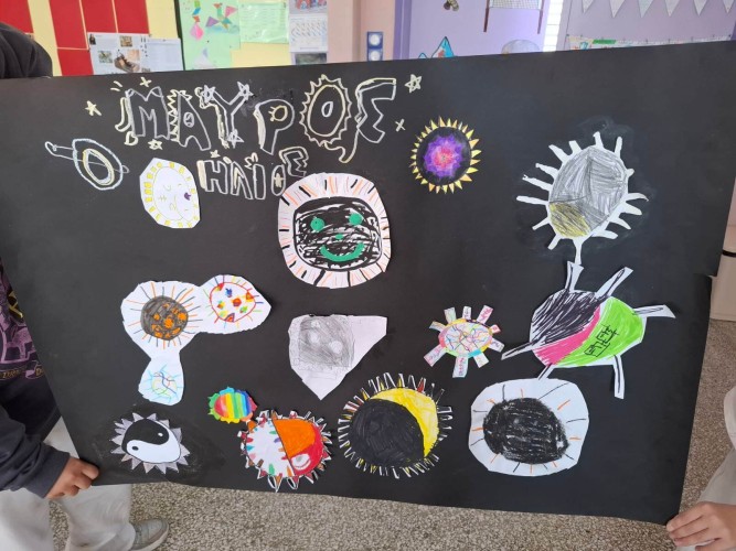 07 Οκτωβρίου 2024Ήλιος, ο αστέρας του ηλιακού μας συστήματος, το λαμπρότερο ουράνιο σώμα! Οι μαθητές μας της Δ΄ τάξης με αφορμή το ποίημα «Ο μαύρος ήλιος» του Τζιάνι Ροντάρι που μελέτησαν στο μάθημα της Γλώσσας αναρωτήθηκαν γιατί συμβαίνουν οι ηλιακές εκλείψεις. Συζήτησαν για το φαινόμενο κατά το οποίο η σελήνη παρεμβάλλεται ανάμεσα στον ήλιο και τη γη και είδαν σε σχετικό power point τους τρεις τύπους της ηλιακής έκλειψης: τη μερική, τη δακτυλιοειδή και την ολική. Στη συνέχεια, εμπνευσμένοι από την ηρωίδα του ποιήματος ζωγράφισαν πρωτότυπους «παράξενους ήλιους» και δήλωσαν με μια φράση πού αποδίδουν αυτή την παραξενιά τους.