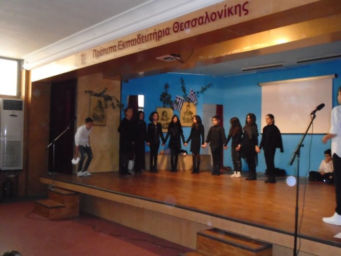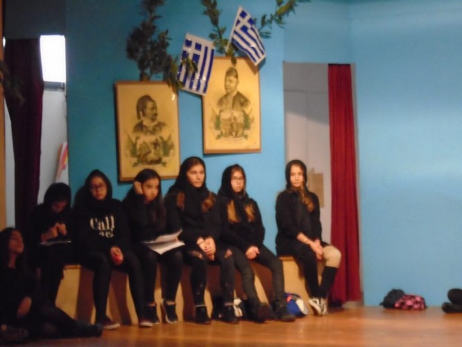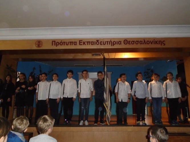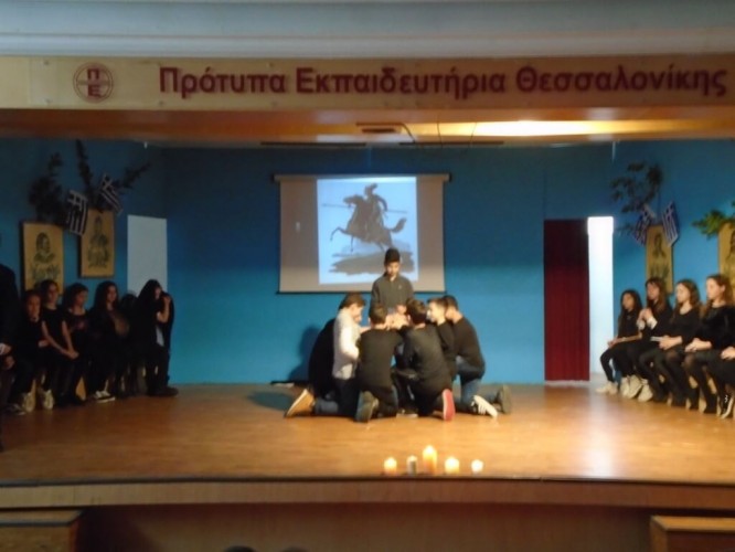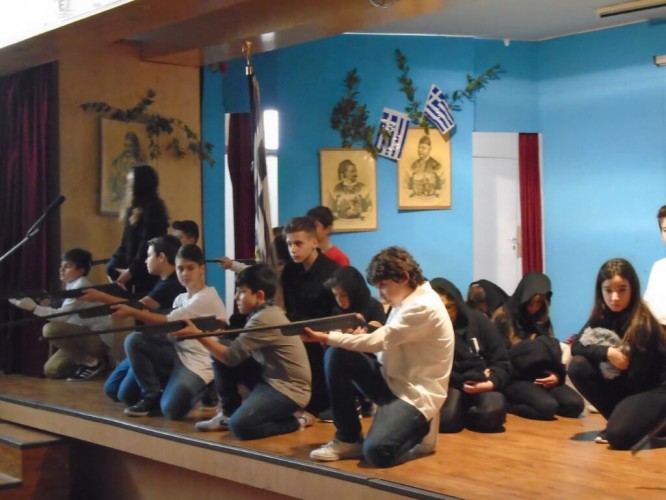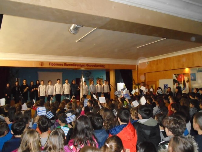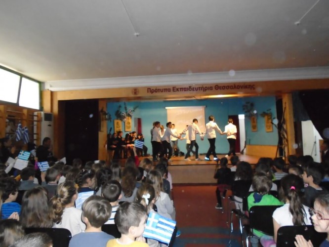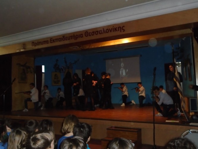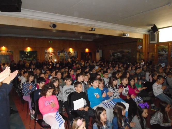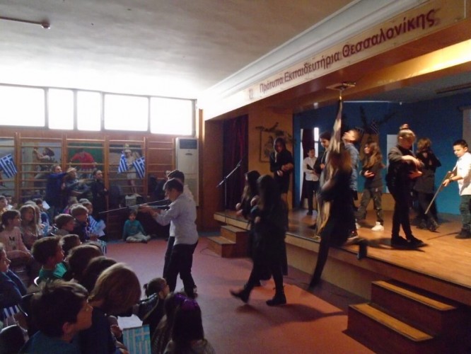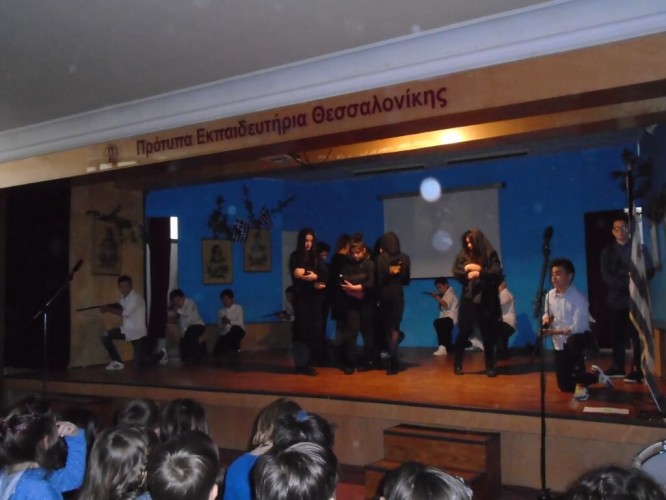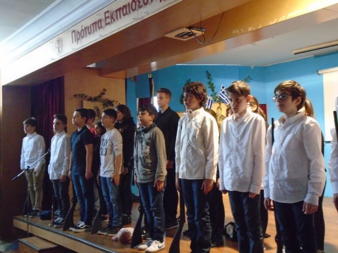 24 Μαρτίου 2018Στις 24 Μαρτίου οι μαθητές της Στ' τάξης παρουσίασαν στους μαθητές των άλλων τάξεων ένα χρονικό της Επανάστασης του 1821.Το αφιέρωμα κινήθηκε στο πλαίσιο του στοχασμού ενός σπουδαίου γεγονότος και συγκίνησε όσους το παρακολούθησαν. Οι μαθητές από σκηνής απήγγειλαν, αφηγήθηκαν, τραγούδησαν και χόρεψαν δίνοντας τον καλύτερό τους εαυτό αποτίοντας στους πραγματικούς πρωταγωνιστές του ‘21 την ευγνωμοσύνη που τους οφείλουμε για τις ενδοξότερες σελίδες του έθνους μας.