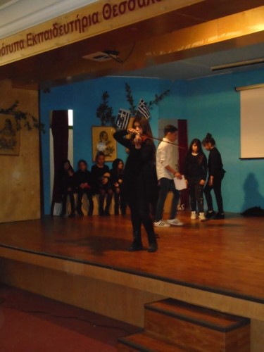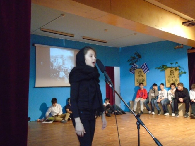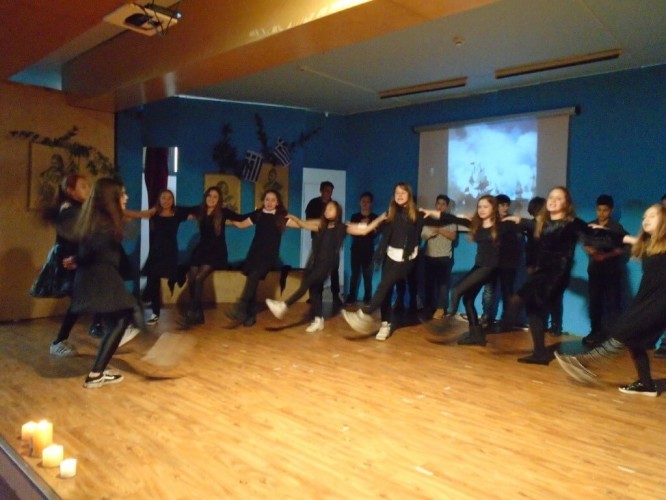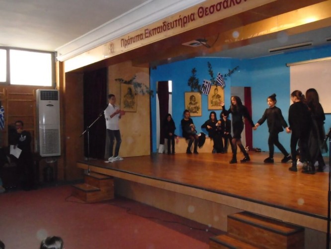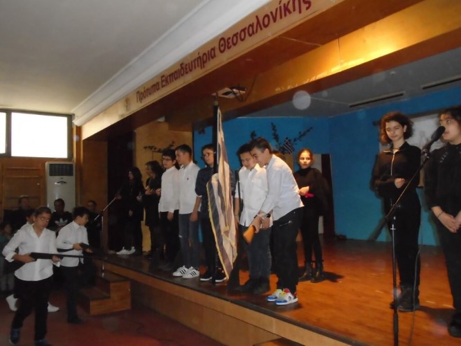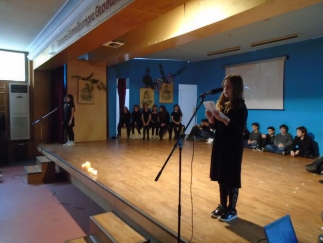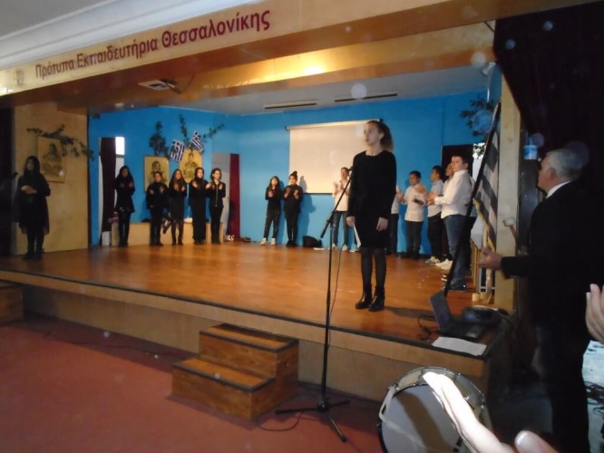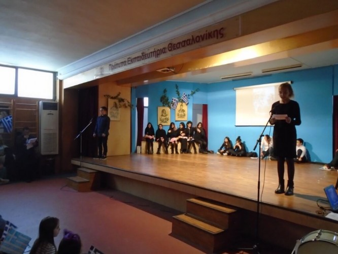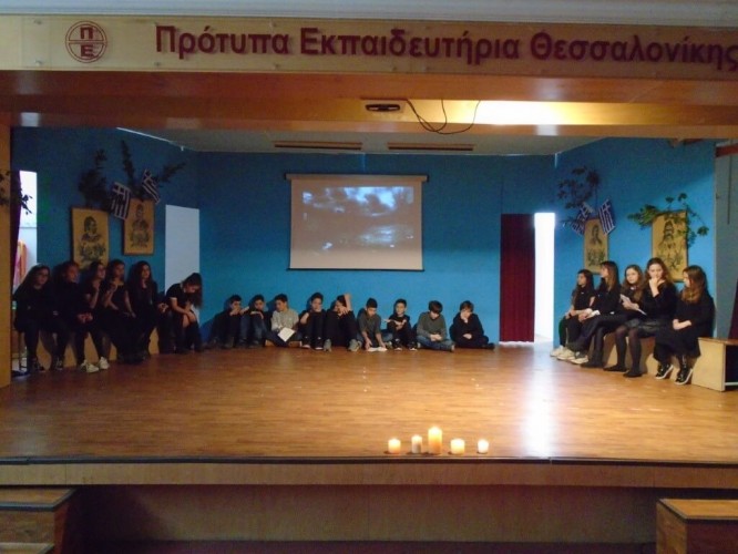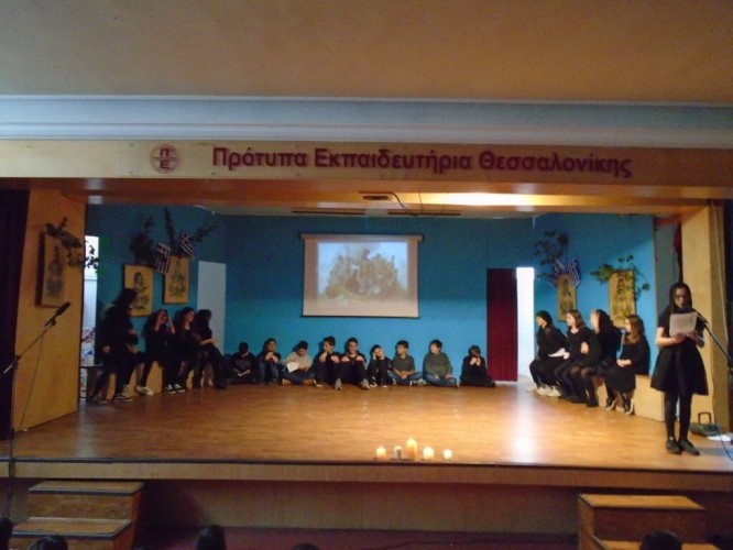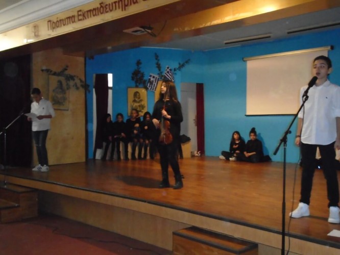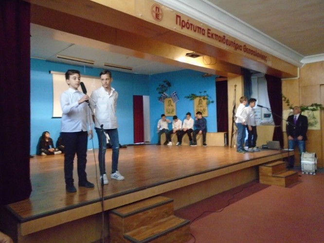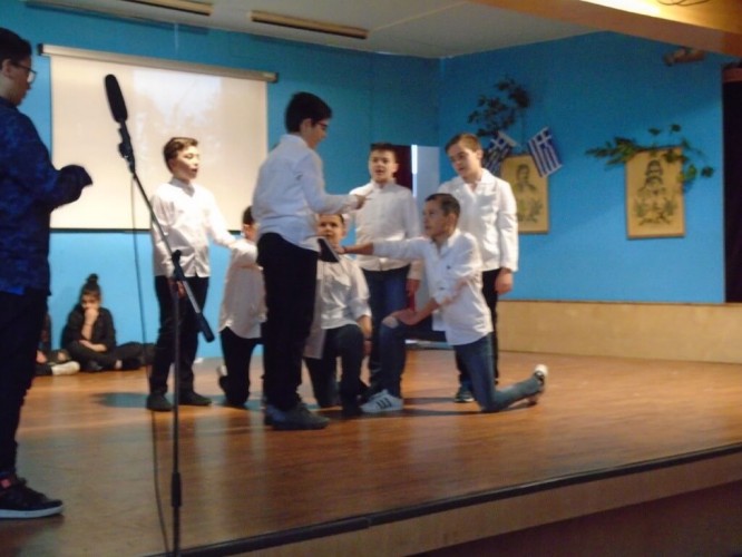 24 Μαρτίου 2018Στις 24 Μαρτίου οι μαθητές της Στ' τάξης παρουσίασαν στους μαθητές των άλλων τάξεων ένα χρονικό της Επανάστασης του 1821.Το αφιέρωμα κινήθηκε στο πλαίσιο του στοχασμού ενός σπουδαίου γεγονότος και συγκίνησε όσους το παρακολούθησαν. Οι μαθητές από σκηνής απήγγειλαν, αφηγήθηκαν, τραγούδησαν και χόρεψαν δίνοντας τον καλύτερό τους εαυτό αποτίοντας στους πραγματικούς πρωταγωνιστές του ‘21 την ευγνωμοσύνη που τους οφείλουμε για τις ενδοξότερες σελίδες του έθνους μας.