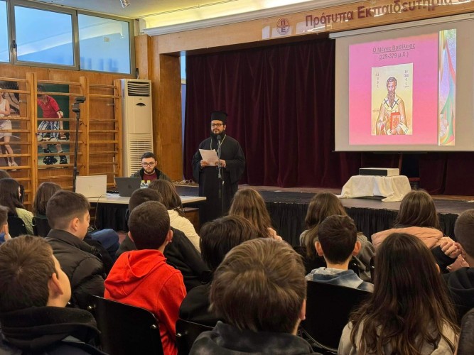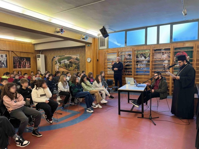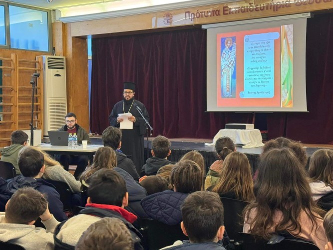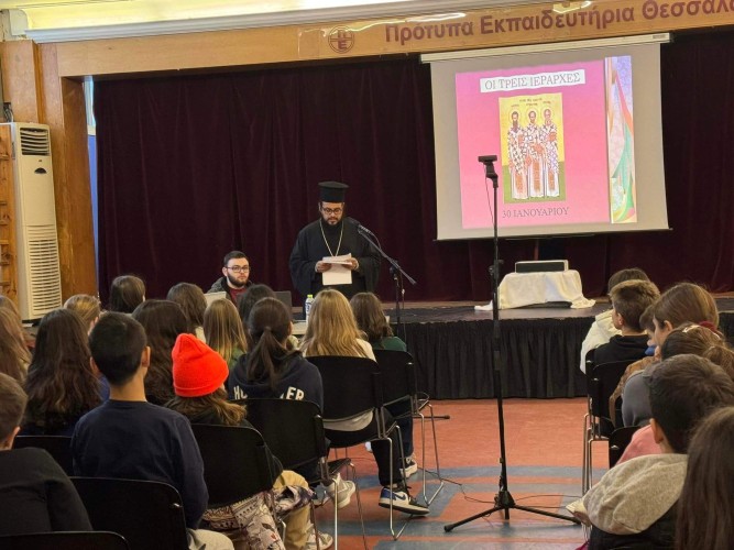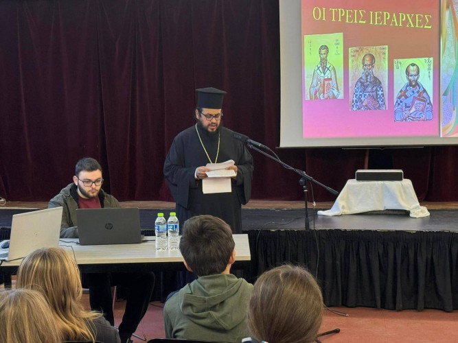 30 Ιανουαρίου 2024Την Τρίτη 30 Ιανουαρίου τα παιδιά μας του Δημοτικού τίμησαν τους Τρεις Ιεράρχες μαθαίνοντας για τον βίο και το έργο τους στην ενημερωτική ομιλία που πραγματοποιήθηκε στο Σχολείο μας. Οι μαθητές μας πληροφορήθηκαν για τη ζωή και το έργο του Μεγάλου Βασιλείου, του Γρηγορίου του Θεολόγου και του Ιωάννη Χρυσοστόμου που μερίμνησαν για τη διαφύλαξη και διάδοση της αποστολικής παράδοσης. Ευχαριστούμε τον πατέρα Θωμά από τον Ιερό Ναό Προφήτη Ηλία για την εμπνευσμένη ομιλία του.