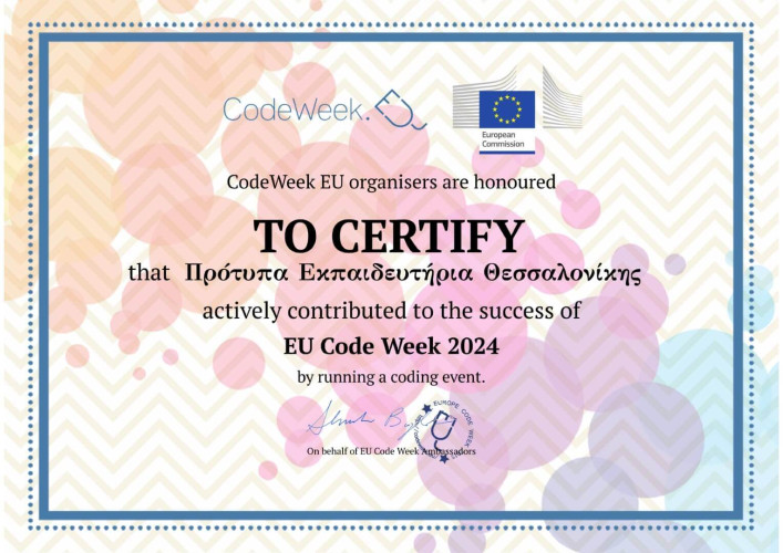 27 Οκτωβρίου 2024Πολλές και ξεχωριστές δράσεις πραγματοποίησαν τα νηπιάκια μας μέσα στον μήνα που πέρασε. Από τις 14 έως τις 27 Οκτωβρίου τα παιδιά μας συμμετείχαν στην Ευρωπαϊκή Εβδομάδα Κώδικα Eucodeweek 2024. Με τη χρήση bee-bot αλλά και unplugged δραστηριοτήτων, στις οποίες δεν απαιτείται συσκευή ή σύνδεση στο διαδίκτυο, συμμετείχαν σε «συμμαχίες» και έλαβαν το πιστοποιητικό τους. Συνεχίζουμε με πολλές ακόμη παρόμοιες δραστηριότητες…