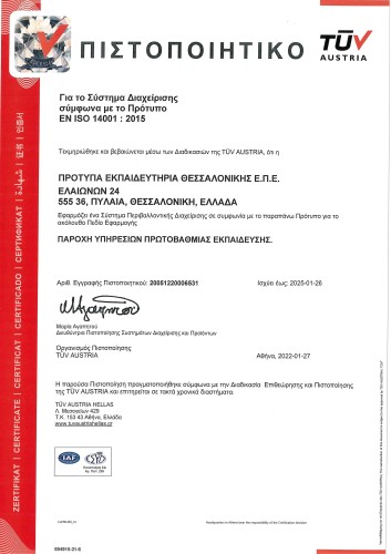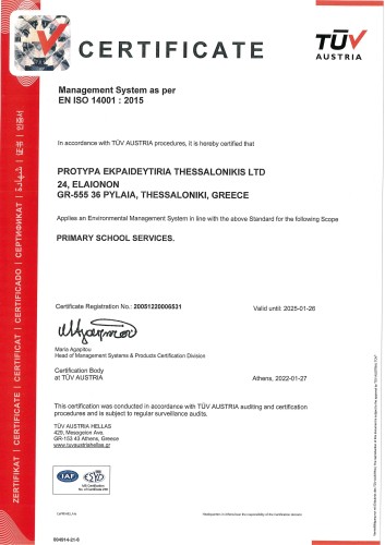08 Φεβρουαρίου 2022Με χαρά ανακοινώνουμε ότι αποκτήσαμε την πιστοποίηση για το Σύστημα Διαχείρισης Περιβάλλοντος ISO 14001:2015 από τον Οργανισμό Επιθεώρησης, Πιστοποίησης και Εκπαίδευσης, TÜV AUSTRIA HELLAS. Πιστοί στο όραμα, τις αρχές και τη φιλοσοφία του αειφόρου Σχολείου μας καινοτόμουμε εφαρμόζοντας το Σύστημα Περιβαλλοντικής Διαχείρισης, μιας ποικιλίας πρακτικών διαχείρισης που αφορούν το Σχολείο και τη λειτουργία του και μειώνουν την επίδρασή του στο περιβάλλον. Επιλέγουμε να παρακολουθούμε συνεχώς τις εξελίξεις σε ό,τι αφορά τα θέματα Διαχείρισης του Περιβάλλοντος, προκειμένου οι δραστηριότητες του Σχολείου μας να είναι καινοτόμες και περιβαλλοντικά συμβατές.