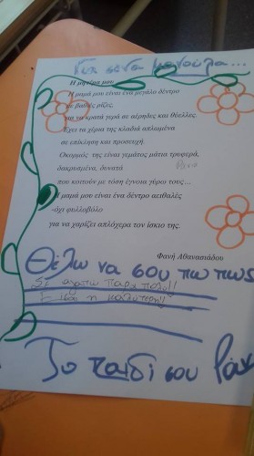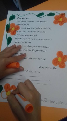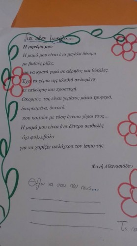 16 Μαΐου 2018Με ένα όμορφο ποίημα, στολισμένο με λουλούδια και ευχές από την καρδιά τους οι μικροί μαθητές της Γ τάξης ετοίμασαν το δικό τους γράμμα για τη μανούλα τους. Το σφράγισαν με το πιο γλυκό φιλί και το φύλαξαν για να της το προσφέρουν με την πιο ζεστή αγκαλιά τους...