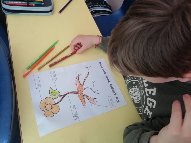 16 Μαΐου 2023Τα παιδιά μας της Α' τάξης πραγματοποίησαν μια σειρά αειφορικών δράσεων. Αρχικά, συζήτησαν για την τοπική χλωρίδα και μίλησαν για το πώς αναπτύσσονται τα φυτά, τις ανάγκες που έχουν (αέρα, ήλιο, χώμασ, νερό), καθώς και το πώς κατηγοριοποιούνται ανάλογα με τον βλαστό τους (πόες, θάμνοι, δέντρα) και το φύλλωμά τους (φυλλοβόλα, αειθαλή), κάνοντας σχετικά φύλλα εργασίας. Έπειτα, κάθε ομάδα διάλεξε από ένα διαφορετικό λουλούδι και με τη συνοδεία της μουσικής του Mozart παρουσίασε το δικό της μουσικοκινητικό δρώμενο, αφήνοντας τις άλλες ομάδες να μαντέψουν τι λουλούδι είναι.