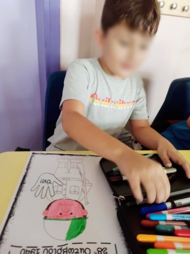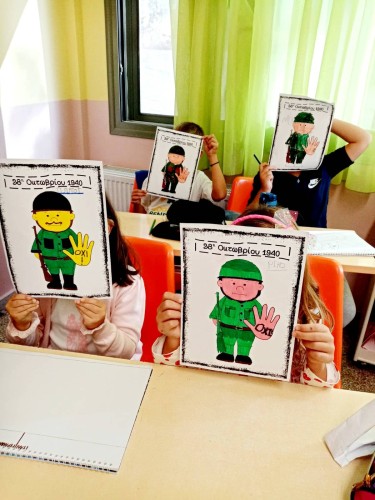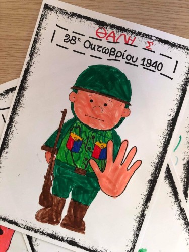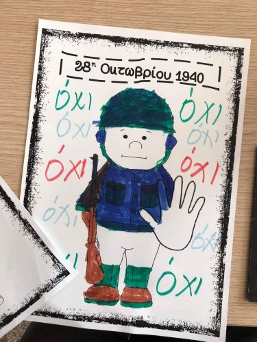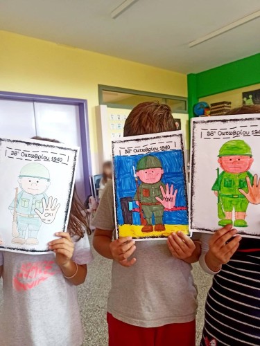 25 Οκτωβρίου 2022Οι μαθητές μας της Β’ τάξης τίμησαν τη μνήμη των αγωνιστών μας ζωγραφίζοντας έναν στρατιώτη, ο οποίος λέει περήφανα «ΟΧΙ» στον κατακτητή! Προηγουμένως είχαν συζητήσει με τις δασκάλες τους ανά τμήμα για τα σημαντικότερα γεγονότα της εθνικής μας επετείου της 28ης Οκτωβρίου, ενώ κατά τις πρωινές ώρες παρακολούθησαν, όπως και όλες οι τάξεις το Δημοτικού μας την επετειακή γιορτή της Ε’ Τάξης.