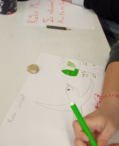 02 Μαρτίου 2022Τα παιδιά μας της Δ’ τάξης γιορτάζουν τον ερχομό της άνοιξης φορώντας μαρτάκια! Οι δασκάλες τους έφτιαξαν για κάθε παιδί και έναν Μάρτη και τους τον μοίρασαν. Ύστερα, τα παιδιά μας ζωγράφισαν χελιδόνια και λουλούδια, ενώ στο τέλος του μήνα σκοπεύουν να κρεμάσουν τους Μάρτηδές τους στα δέντρα της αυλής. Καλό μήνα!
