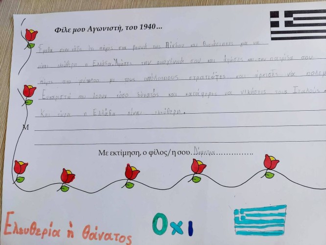 25 Οκτωβρίου 2022Τα παιδιά μας της Γ’ Τάξης γιόρτασαν την εθνική μας επέτειο και τίμησαν τους αγωνιστές μας εκφράζοντας τις σκέψεις τους γι’ αυτούς. Έτσι, αφού παρακολούθησαν στον διαδραστικό πίνακα της τάξης τους ιστορικά βίντεο και άκουσαν αγωνιστικά τραγούδια ηρώων, κατέγραψαν σε μία φόρμα που τους δόθηκε τη γνώμη και τα συναισθήματά τους για εκείνους.