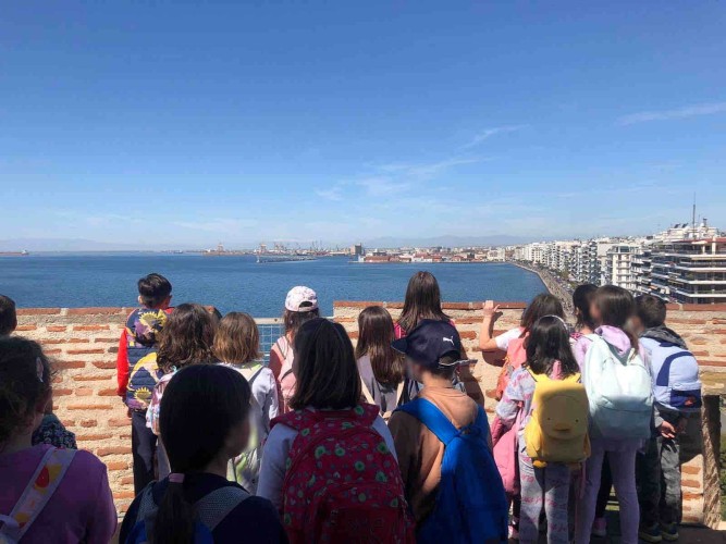 Μεγάλη συγκίνηση αισθάνθηκαν τα παιδιά μας αλλά και οι δάσκαλοί τους περνώντας την είσοδο του Λευκού Πύργου όπου ανακάλυψαν σκαλί σκαλί σημαντικούς σταθμούς της πολιτιστικής μας κληρονομιάς. Ανταμείφθηκαν από το υπέροχο γαλάζιο του Θερμαϊκού, φτάνοντας στην κορυφή του μνημείου. Στη συνέχεια, σειρά είχαν οι περιπέτειες και το στρατηγικό δαιμόνιο του Μεγαλέξανδρου. Μπροστά από το μεγαλοπρεπές άγαλμα άκουσαν για όλες τις κατακτήσεις του μεγάλου στρατηλάτη, που έφτασε μέχρι την Ινδία μεταφέροντας εκεί τον μακεδονικό πολιτισμό.