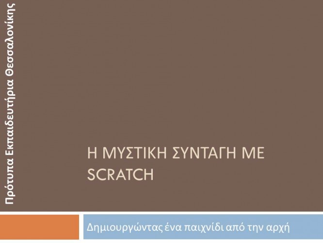 To scratch αναπτύχθηκε από το Τεχνολογικό Ινστιτούτο Μασαχουσέτης (MIT). Αποτελεί ένα εκπαιδευτικό περιβάλλον ανάπτυξης διαδραστικών εφαρμογών και εκμάθησης προγραμματισμού για παιδιά ηλικίας από 8 έως 16 ετών. Τα παιδιά έχουν την δυνατότητα να δημιουργήσουν παιχνίδια, κουίζ ερωτήσεων, ιστορίες και κινούμενα σχέδια. Το περιβάλλον ανάπτυξης του Scratch μπορεί να μεταφορτωθεί δωρεάν και να εγκατασταθεί σε οποιοδήποτε υπολογιστή. Επιπλέον, μπορεί κανείς να το βρει και στο διαδίκτυο (http://scratch.mit.edu/) και αφού δημιουργήσει προσωπικό λογαριασμό μπορεί να προγραμματίσει online, να μοιραστεί τα έργα του με άλλους χρήστες, να τροποποιήσει και να επεκτείνει τα έργα άλλων χρηστών. Εμείς δουλέψαμε offline, στο εγκατεστημένο πρόγραμμα στους Η/Υ μας.