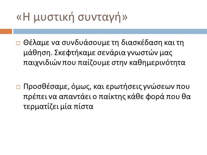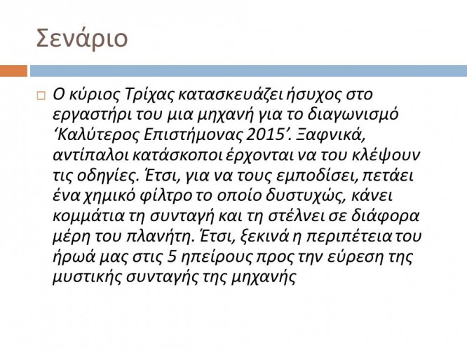 «Ο κύριος Τρίχας κατασκευάζει ήσυχος στο εργαστήρι του μια μηχανή για το διαγωνισμό ‘Καλύτερος Επιστήμονας 2015’. Ξαφνικά, αντίπαλοι κατάσκοποι έρχονται να του κλέψουν τις οδηγίες. Έτσι, για να τους εμποδίσει, πετάει ένα χημικό φίλτρο το οποίο δυστυχώς, κάνει κομμάτια τη συνταγή και τη στέλνει σε διάφορα μέρη του πλανήτη. Έτσι, ξεκινά η περιπέτεια του ήρωά μας στις 5 ηπείρους προς την εύρεση της μυστικής συνταγής της μηχανής». Το παραπάνω κείμενο αποτελεί το σενάριο του παιχνιδιού «Η μυστική συνταγή», το οποίο ανέπτυξαν οι μαθητές της Ε’ και ΣΤ’ δημοτικού στο περιβάλλον δημιουργίας παιχνιδιών Scratch. Πρωταγωνιστής είναι ο επιστήμονας κύριος Τρίχας, ο οποίος πρέπει να αποδείξει την ταυτότητά του απαντώντας σε ερωτήσεις γενικών γνώσεων, που του δίνουν πίσω κάθε φορά και από ένα κομμάτι της μυστικής συνταγής. Για την επιτυχή ολοκλήρωση κάθε πίστας, ο παίκτης του παιχνιδιού καλείται να επιστρατεύσει τις γνώσεις του και τη στρατηγική του.