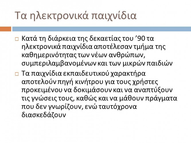 Τα Ηλεκτρονικά Παιχνίδια αποτελούν ένα ταχύτατα αναπτυσσόμενο πεδίο, καθώς αποτελούν τη δημοφιλέστερη τεχνολογία στη διασκέδαση των νέων. Στην αρχή η χρήση τους αφορούσε αποκλειστικά και μόνο τη νεολαία και τους ενήλικους νεαρής ηλικίας, οι οποίοι ήταν εξοικειωμένοι με την τεχνολογία των υπολογιστών. Κατά τη διάρκεια της δεκαετίας του ’90 τα ηλεκτρονικά παιχνίδια αποτέλεσαν τμήμα της καθημερινότητας των νέων ανθρώπων, συμπεριλαμβανομένων και των μικρών παιδιών. Από τις πρώτες έρευνες που έγιναν για την χρήση των παιχνιδιών στην εκπαίδευση διαπιστώθηκε ότι αποτελούν μία πηγή κινήτρου για τους χρήστες προκειμένου να δοκιμάσουν, να αναπτύξουν και να εφαρμόσουν τις γνώσεις τους, καθώς και να μάθουν πράγματα που δεν γνωρίζουν, ενώ ταυτόχρονα διασκεδάζουν.