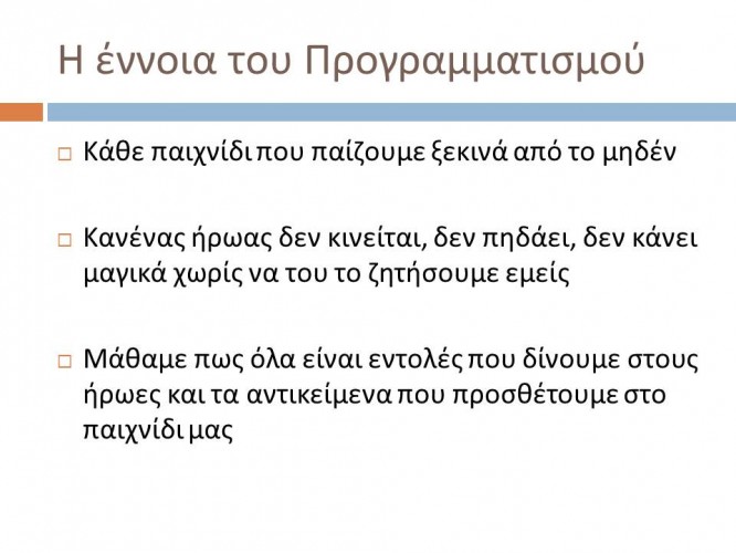 Όταν πια μπήκαμε να δουλέψουμε στο περιβάλλον του scratch καταλάβαμε πως κάθε παιχνίδι που παίζουμε ξεκινά από το μηδέν. Κανένας ήρωας δεν κινείται, δεν πηδάει, δεν κάνει μαγικά χωρίς να του το ζητήσουμε εμείς.