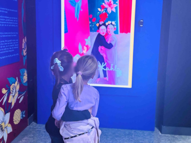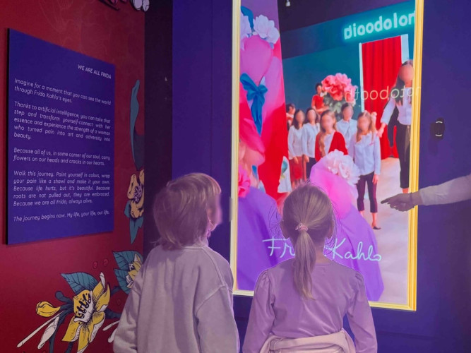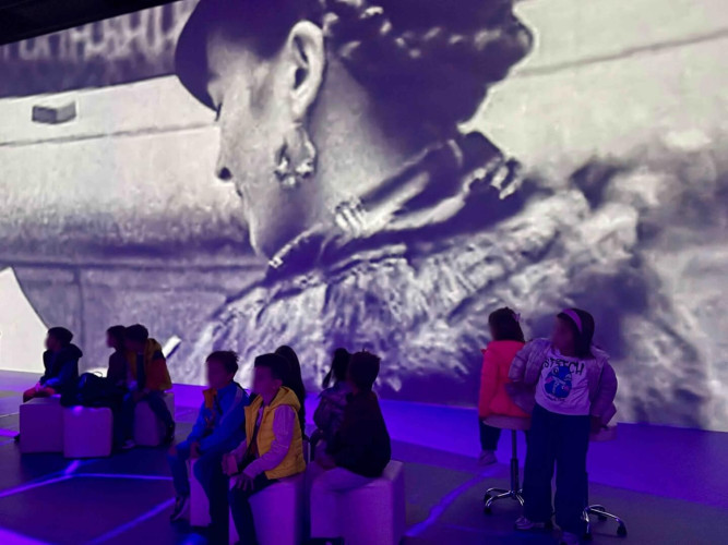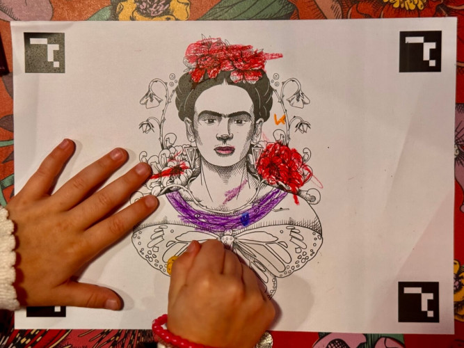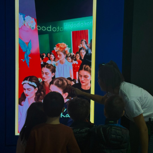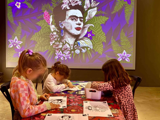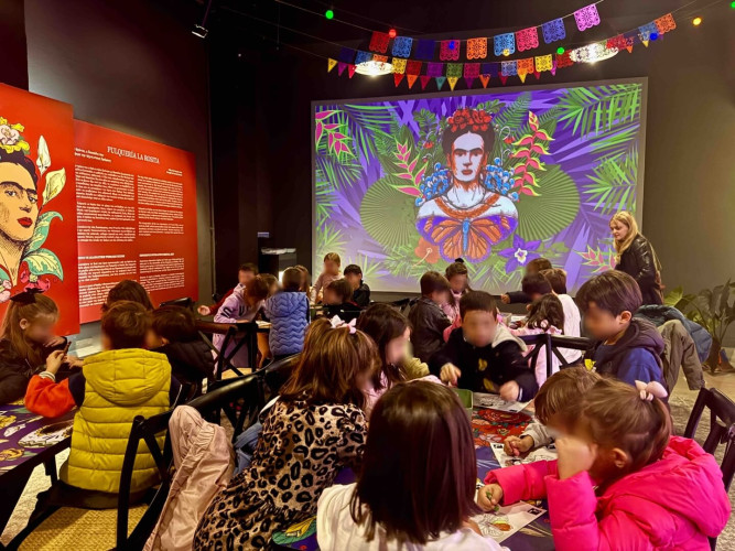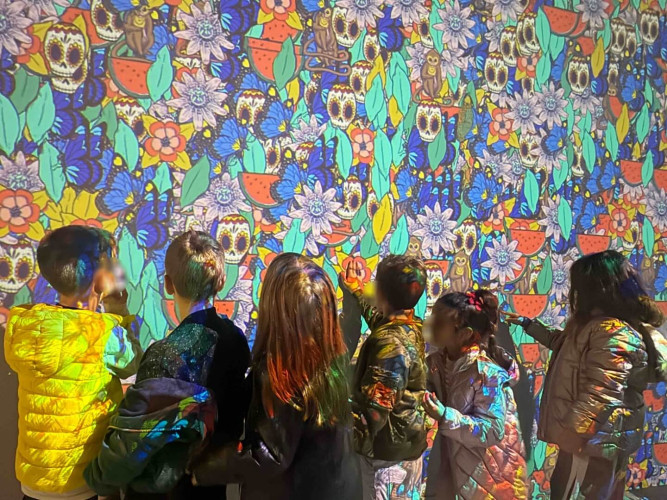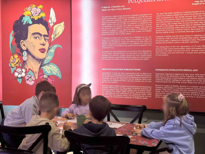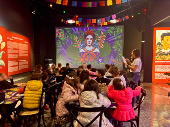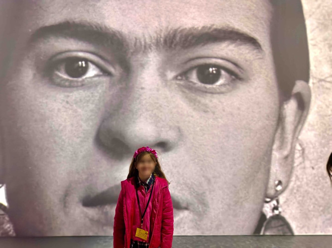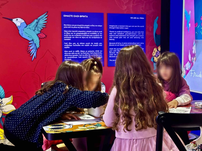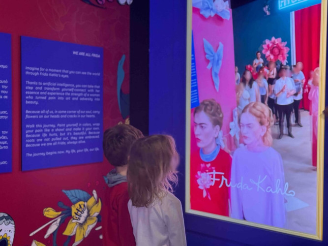 22 Οκτωβρίου 2025Την Τετάρτη 15, την Παρασκευή 17 και την Τετάρτη 22 Οκτωβρίου οι μαθητές μας των Α΄, Β΄ και Γ΄ τάξεων εξερεύνησαν τον «κόσμο» της Frida Kahlo κατά τη διάρκεια της επίσκεψής τους στην έκθεση «Beyond the Icon», η οποία είναι αφιερωμένη στη μεξικανή καλλιτέχνιδα. Εκεί, τα παιδιά είχαν την ευκαιρία να παρακολουθήσουν ένα εκπαιδευτικό πρόγραμμα και να κάνουν ένα «ταξίδι» στον χρόνο μέσα από ψηφιακές προβολές και εικονική πραγματικότητα. Σε αυτή την ιδιαίτερη εμπειρία άκουσαν την ιστορία της σπουδαίας ζωγράφου, γνώρισαν το έργο της και έμαθαν κρυφές πτυχές της ζωής της που αποτέλεσαν πηγή δημιουργίας για την ίδια. Οι μαθητές έπιασαν τα χρώματα και λίγο μετά είδαν τις ζωγραφιές τους να ζωντανεύουν στην οθόνη, τόσο ίδιες αλλά και τόσο διαφορετικές. Με βιωματικές δραστηριότητες ήρθαν σε επαφή με την τέχνη και τον πολιτισμό ανακαλύπτοντας νέες μορφές καλλιτεχνικής έκφρασης.