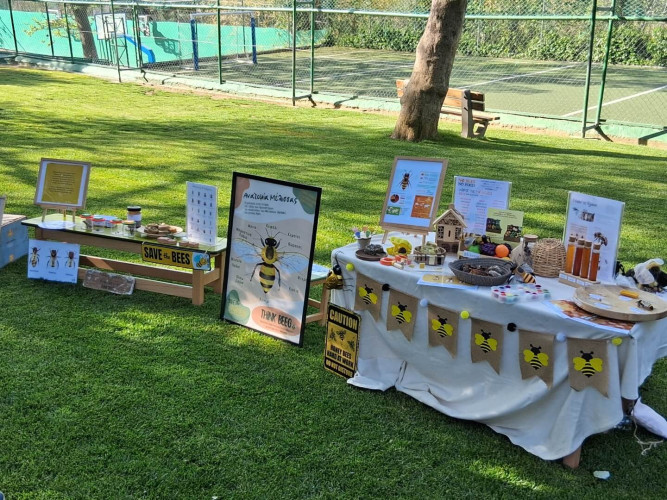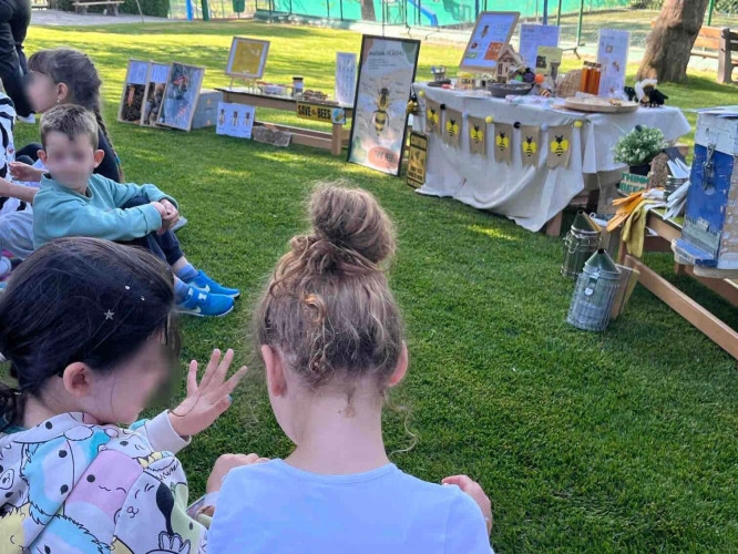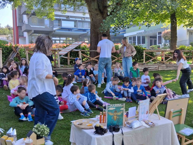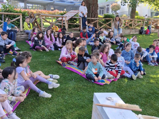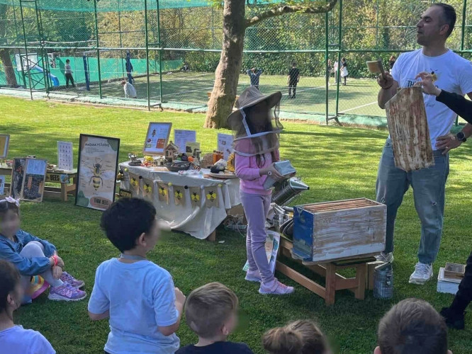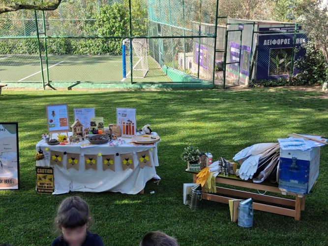 Με έκπληκτα μάτια οι μαθητές μας είδαν μπροστά τους να παρουσιάζεται ο μοναδικός κόσμος των μελισσών από την ομάδα του Think Beeg στο πλαίσιο της Δημιουργικής Απασχόλησης του Δημοτικού για την περίοδο του Πάσχα. Με αφορμή την παγκόσμια ημέρα της γης, κυψέλες, ομοιώματα μέλισσας, μελισσοκέρι και κάθε ποικιλία μελιού τοποθετήθηκαν στην καταπράσινη αυλή μας και τα παιδιά μας τα θαύμασαν από κοντά. Αυτό που τους τράβηξε την προσοχή ήταν κάποια από τα εργαλεία ενός μελισσοκόμου: το ειδικό καπέλο και το κάνιστρο. Στη συνέχεια, χωρισμένοι σε ομάδες οι μικροί εξερευνητές ενημερώθηκαν για τη ζωή και και την προσφορά της μέλισσας στον πλανήτη συμμετέχοντας στις ερωτήσεις που τέθηκαν. Τα παιδιά ανέλαβαν τους ρόλους της Βασίλισσας, του Φύλακα, της Νοσοκόμας, της Εργάτριας και βιωματικά πληροφορήθηκαν για τα διαφορετικά είδη των μελισσών. Ακόμα, κατανόησαν τον τρόπο λειτουργίας μιας κυψέλης, άκουσαν για το πώς οι μέλισσες φτιάχνουν το μέλι, έμαθαν για την κοινωνία των μελισσών και το περιβάλλον στο οποίο ζουν.