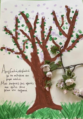 25 Απριλίου 2024Τα μικρά μας του Παιδικού Σταθμού «Πρότυπα 2-4» μύρισαν τα ανθισμένα κλαδιά της αμυγδαλιάς και «γοητεύτηκαν» από την ομορφιά της. Συνειρμικά ένα ποιηματάκι συνόδευσε αυτή την ξεχωριστή τους εμπειρία: «Καλώς την ανοιξούλα με τις ωραίες ευωδιές, που ευφραίνουν την ψυχούλα σε κήπους, λιβάδια και αυλές. Καλώς τις μελισσούλες πάνω εκεί στα λουλουδάκια, πασχαλίτσες, πεταλούδες και γλυκόλαλα πουλάκια!».