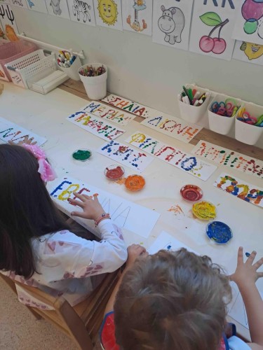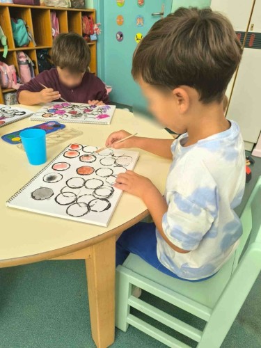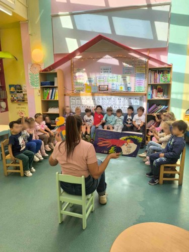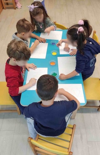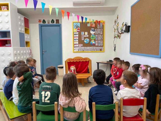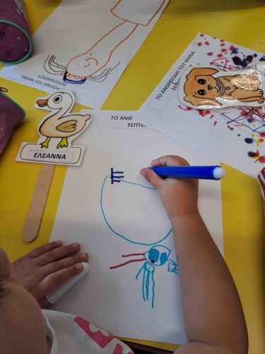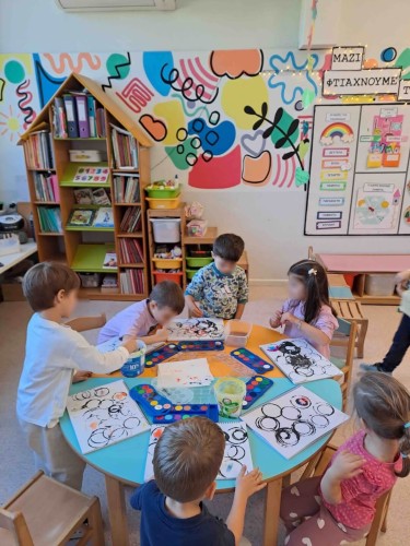Με τα δάχτυλά τους σχημάτισαν τελείες γράφοντας το όνομά τους, αποτύπωσαν κύκλους στα μπλοκ τους οποίους χρωμάτισαν με νερομπογιές και ζωγράφισαν ελεύθερα τους φίλους τους. Η εβδομάδα έκλεισε με τους ήρωες του κουκλοθεάτρου να βρίσκουν τη λύση στα προβλήματά τους κατά τη διάρκεια του έργου που παρουσιάστηκε.