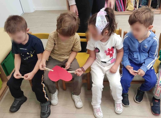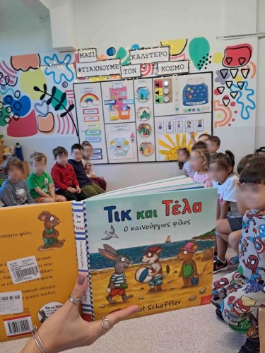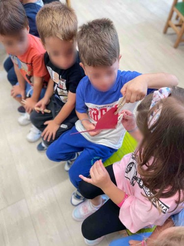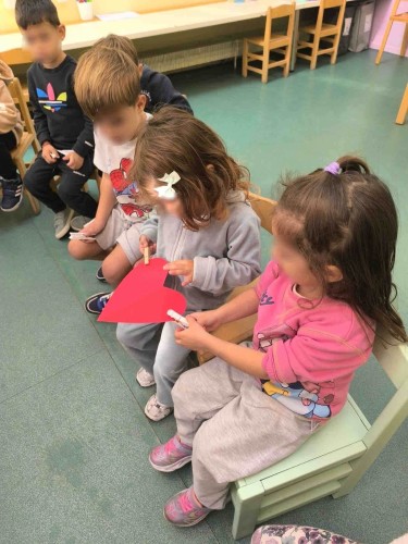 Οι μαθητές μας απόλαυσαν τις ιστορίες: «Τικ και Τέλα: Ο καινούργιος φίλος» και «Ας πούμε αυτή τη λέξη» και διατύπωσαν ευγενικές λεξούλες φτιάχνοντας στη συνέχεια αυτοσχέδιους διαλόγους. Συνεργάστηκαν όλοι μαζί, ώστε κανένας φίλος να μη βγει εκτός παιχνιδιού στις «μουσικές καρέκλες φιλίας» και στην «αλυσίδα της φιλίας», ενώ έπειτα χωρίστηκαν ανά 4-5 άτομα και ομαδοποίησαν τα παιχνίδια της τάξης. Με μικρά μανταλάκια μετέφεραν ο ένας στον άλλον μια μεγάλη χάρτινη καρδιά, σκορπίζοντας αγάπη και αναπτύσσοντας παράλληλα τη λεπτή τους κινητικότητα.