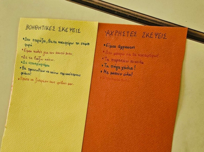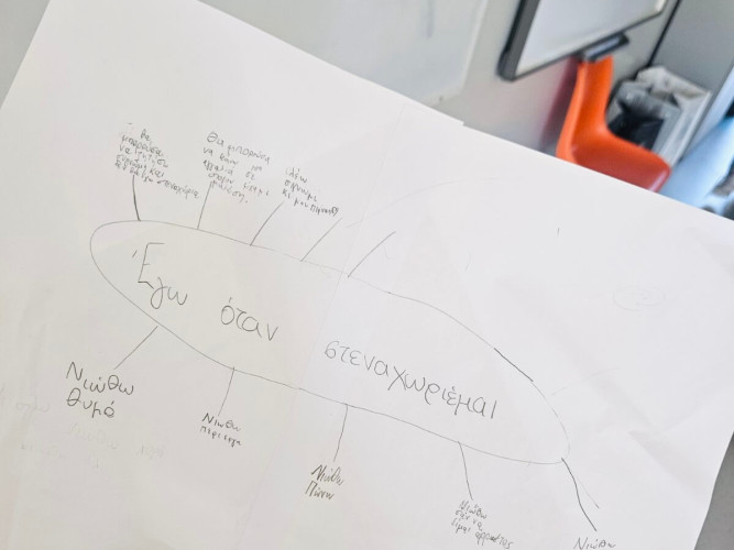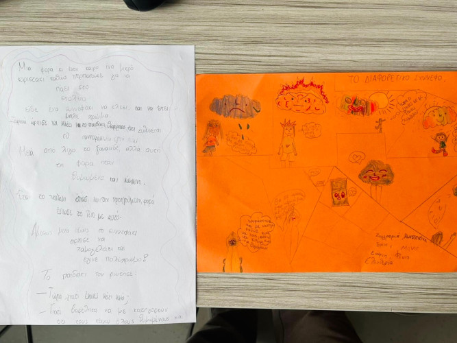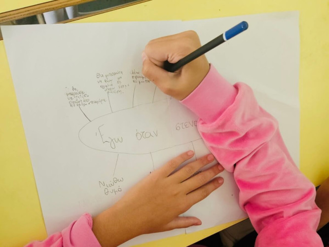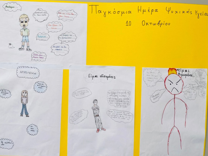 21 Οκτωβρίου 2025Οι μαθητές μας της Ε΄ τάξης χωρίστηκαν σε τέσσερις ομάδες και η κάθε ομάδα ζωγράφισε τις σκέψεις που κάνει ένας άνθρωπος, ανάλογα με τα συναισθήματα που αισθάνεται. Η πρώτη ομάδα ζωγράφισε «τα συναισθήματα του θυμού και της οργής» και επεξεργάστηκε τι νιώθουν, τι κάνουν και τι θα μπορούσαν να κάνουν οι άνθρωποι, όταν θυμώνουν. Η δεύτερη ομάδα κατέγραψε «άσχημες σκέψεις» που κάποιες στιγμές έρχονται στο μυαλό μας, τις οποίες στη συνέχεια αντικατέστησε με ευχάριστους λογισμούς. Η τρίτη ομάδα σχεδίασε κύκλους και οι μαθητές έγραψαν τι νιώθουν, όταν αισθάνονται αδύναμοι. Τέλος, η τέταρτη ομάδα σχεδίασε χαρούμενες φατσούλες εκφράζοντας την αισιοδοξία. Επιπλέον, τα παιδιά μας επικεντρώθηκαν στον έλεγχο του θυμού και στην ενίσχυση της θετικής σκέψης, εστιάζοντας στην αισιοδοξία και στον αυτοέλεγχο. Μέσα από τις δημιουργίες τους εκφράστηκαν ελεύθερα και απέδωσαν με τον δικό τους μοναδικό τρόπο τα συναισθήματα και τις σκέψεις τους.
