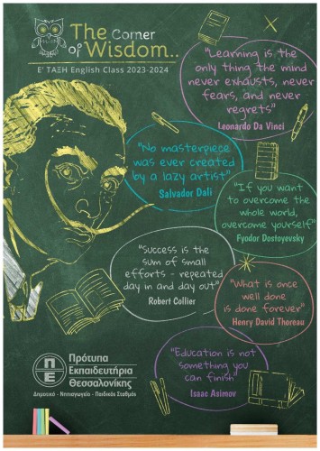 12 Ιουνίου 2024«Κανένα αριστούργημα δε δημιουργήθηκε ποτέ από έναν τεμπέλη καλλιτέχνη», λέει ο Salvador Dali, η φιγούρα του οποίου κοσμεί τη φετινή αναμνηστική αφίσα της Ε΄ τάξης. Η αφίσα φιλοτεχνήθηκε την Τρίτη 11 Ιουνίου στο πλαίσιο του μαθήματος των Αγγλικών και είναι ένα από τα αποτελέσματα της on-line ενότητας "Fun Facts" την οποία παρακολουθούσαν οι μαθητές μας σε όλη τη διάρκεια της σχολικής χρονιάς. Η αφίσα μας περιλαμβάνει αποφθέγματα και από άλλους καλλιτέχνες, τα οποία μιλούν για την αξία της μάθησης και τη διαρκή πρόοδο. Σκοπός μας είναι τα λόγια αυτά να αποτελέσουν έμπνευση για τα παιδιά μας, καθώς στο εξής η αφίσα θα στολίζει τα δωμάτιά τους.