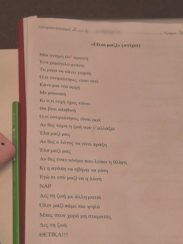 Πρώτος σταθμός, το τραγούδι «Όλοι μαζί». Τα παιδιά αφού το άκουσαν, έγινε νοηματική ανάλυση, επεξεργάστηκαν τα γραμματικά φαινόμενα και έγραψαν ορθογραφία. Το έμαθαν από έξω και το τραγούδησαν, σαν ανάγνωση την επόμενη μέρα και φυσικά πολλοί…το χόρεψαν!