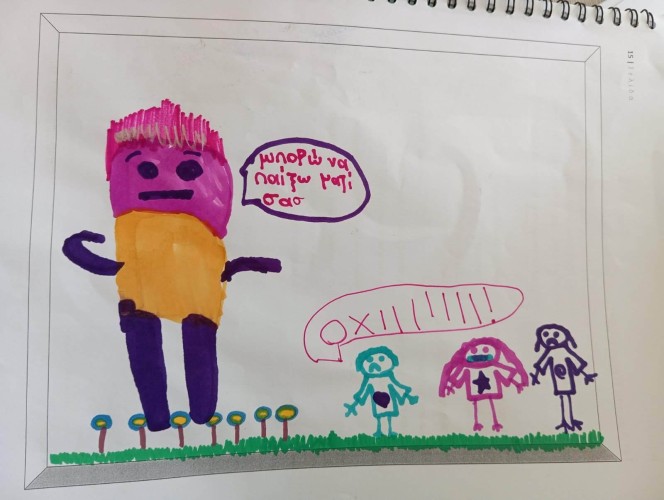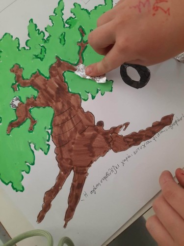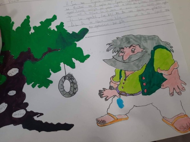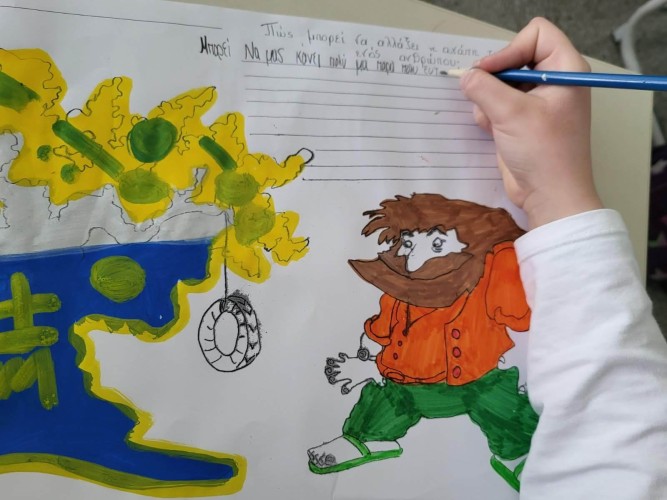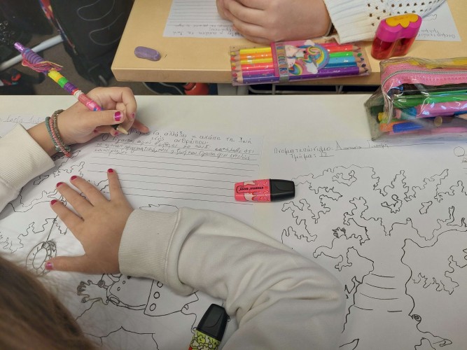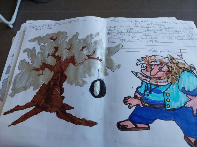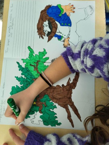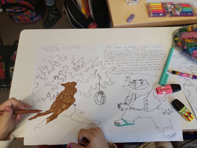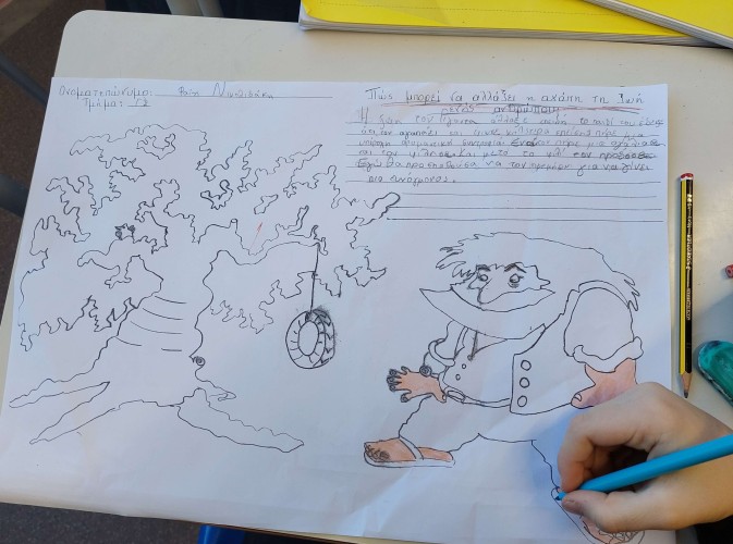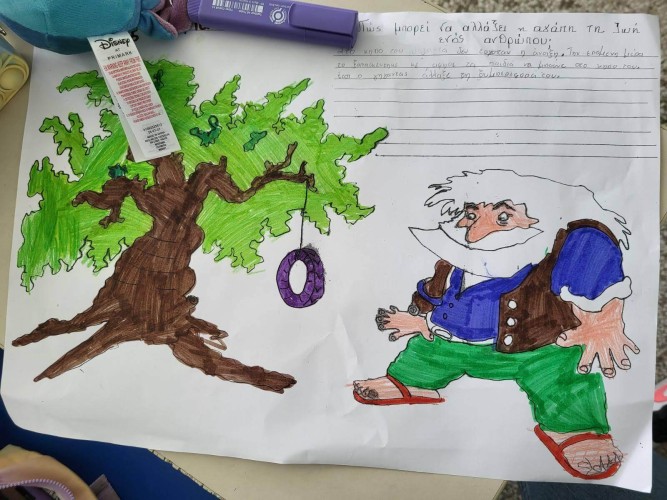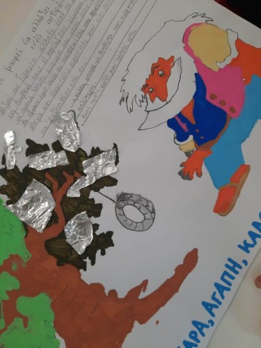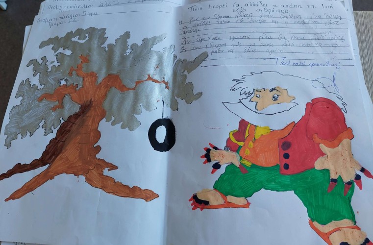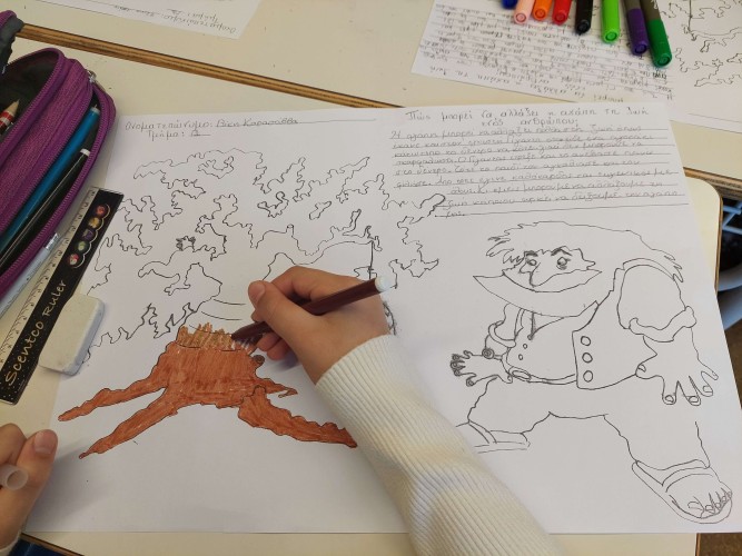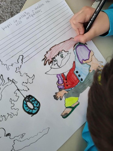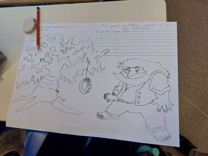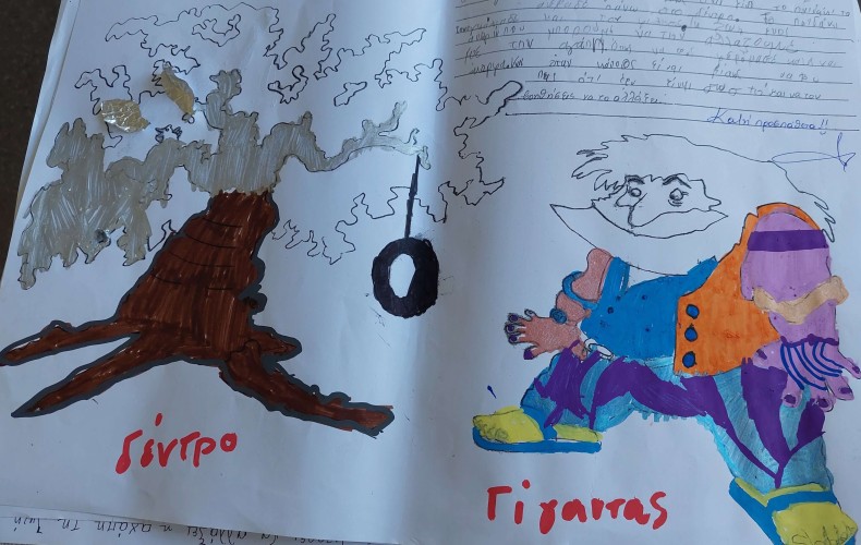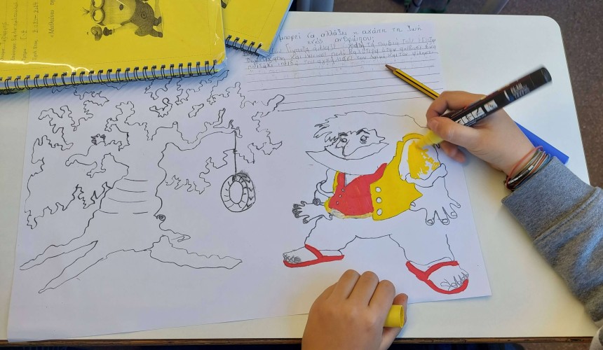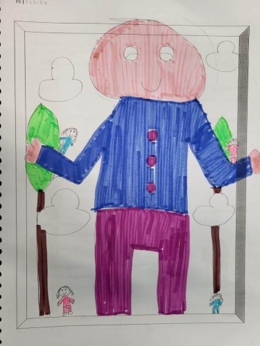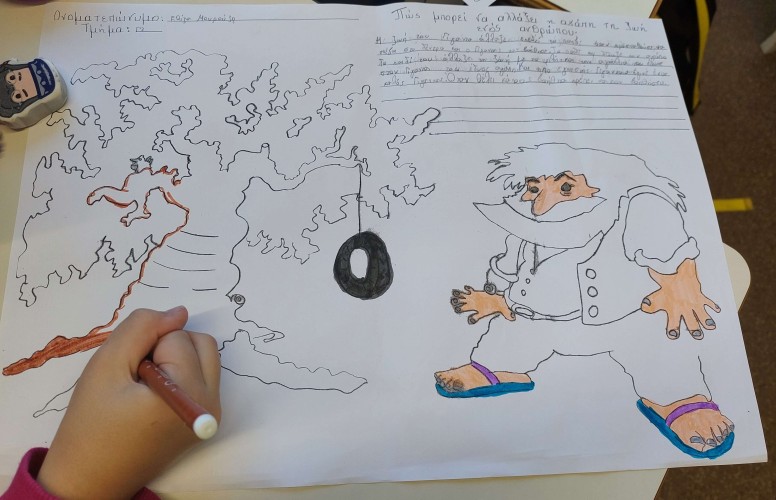 09 Φεβρουαρίου 2024Επιστρέφοντας στην τάξη μετά την παράσταση, μοιραστήκαμε τις εντυπώσεις μας και μιλήσαμε για συναισθήματα, για στάσεις και συμπεριφορές που οδηγούν στη μοναξιά και την αποξένωση αλλά και για τη δύναμη της αγάπης, που μεταμορφώνει. Στη συνέχεια, στο μάθημα της Γλώσσας γράψαμε ένα γράμμα στον Γίγαντα και έπειτα κάθε παιδί «έκανε δική του» την ιστορία του Όσκαρ Ουάιλντ δίνοντάς της ένα διαφορετικό τέλος και ζωγραφίζοντας το αγαπημένο του σημείο της ιστορίας με ζωηρά χρώματα.