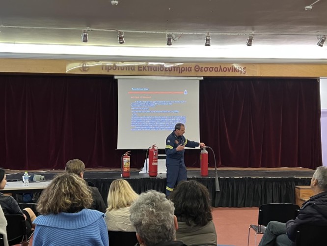 Αρχικά, πραγματοποιήθηκε αναλυτική παρουσίαση από ομάδα του Πυροσβεστικού Σώματος σχετικά με τα είδη των πυροσβεστήρων και την κατάλληλη αντιμετώπιση καταστάσεων έκτακτης ανάγκης, ανάλογα, πάντα, με τις ειδικές συνθήκες που μπορεί να επικρατούν, τόσο στο Σχολείο μας όσο και εκτός αυτού. Έπειτα, ακολούθησε η πρακτική εκπαίδευση στη χρήση όλων των ειδών πυροσβεστήρων στον εξωτερικό χώρο του Σχολείου μας.