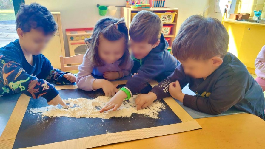 - Δημιούργησαν τις πρωτότυπες ζωγραφιές τους με μοναδικά εργαλεία ένα μαύρο χαρτόνι και αλεύρι, μετακινώντας τα δάκτυλά τους σε διάφορα σχήματα.