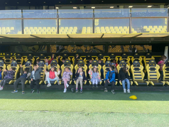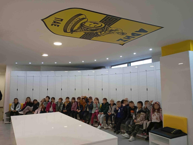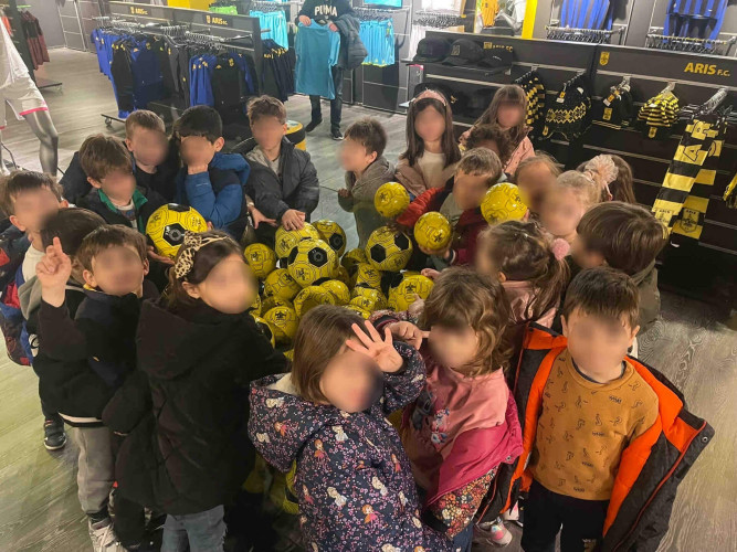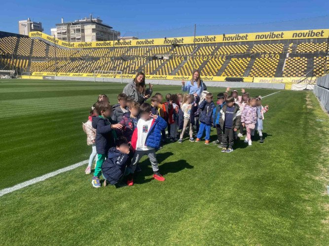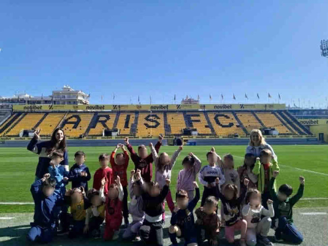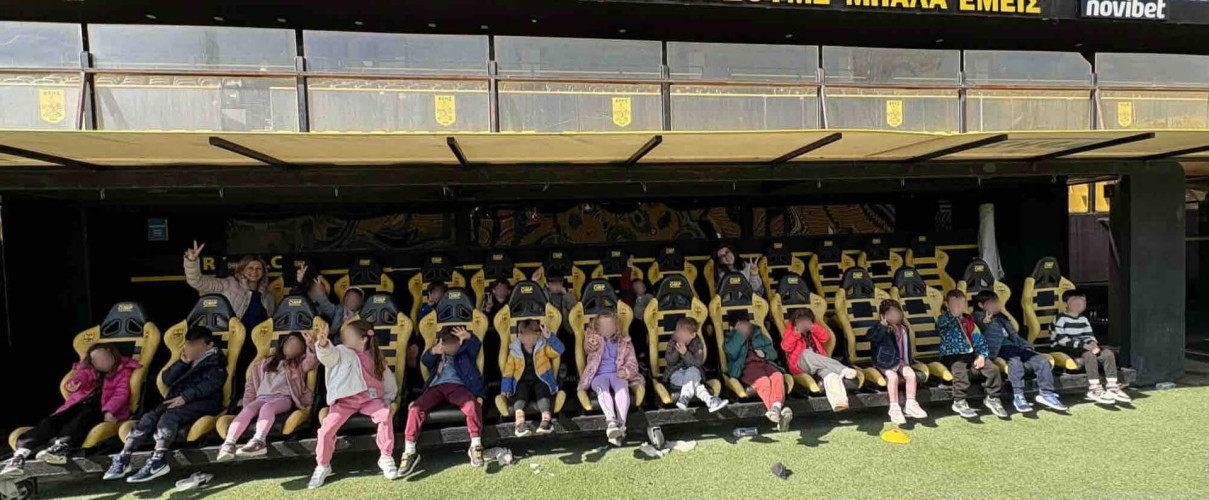 10 Μαρτίου 2026Στο πλαίσιο της θεματικής ενότητας «Μικρά βήματα στη μεγάλη πόλη» τα νηπιάκια μας επισκέφθηκαν το γήπεδο του ΑΡΗ, «Κλεάνθης Βικελίδης» και περιηγήθηκαν στις εγκαταστάσεις του. Εκεί, είχαν την ευκαιρία να έρθουν σε επαφή με τον «κόσμο» του ποδοσφαίρου και να γνωρίσουν βασικές πληροφορίες για το άθλημα. Ξεναγήθηκαν στο γήπεδο, περιπλανήθηκαν στα αποδυτήρια των παικτών και είδαν από κοντά την αίθουσα που παραχωρούν οι προπονητές και οι ποδοσφαιριστές τις συνεντεύξεις Τύπου. Βιωματικά τα παιδιά καλλιέργησαν τις αξίες της συνεργασίας, της ομαδικότητας και της ευγενούς άμιλλας.
