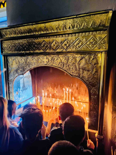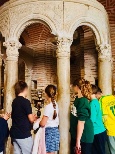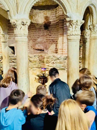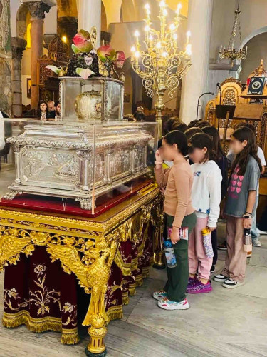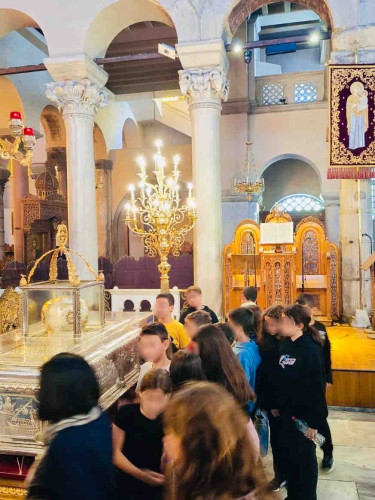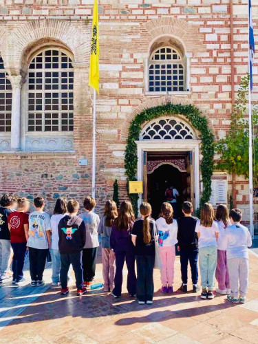 29 Οκτωβρίου 2025Ενόψει του εορτασμού του Πολιούχου της Θεσσαλονίκης, οι μαθητές μας της Ε΄ τάξης επισκέφτηκαν τον Ιερό Ναό του Αγίου Δημητρίου του Μυροβλήτου την Τετάρτη 29 Οκτωβρίου. Συνοδευόμενοι από τους δασκάλους τους ξεναγήθηκαν στον ναό, παρατήρησαν τα ψηφιδωτά και τις αγιογραφίες, προσευχήθηκαν και προσκύνησαν τα ιερά λείψανα του Αγίου. Η περιήγησή τους συνεχίστηκε στις κατακόμβες, στον τόπο του μαρτυρίου του, όπου έδωσε τη ζωή του υπερασπιζόμενος τη χριστιανική πίστη. Τα παιδιά μας μέσα από αυτή την επίσκεψη έμαθαν για τον βίο και την προσφορά του Μεγαλομάρτυρα Δημητρίου.