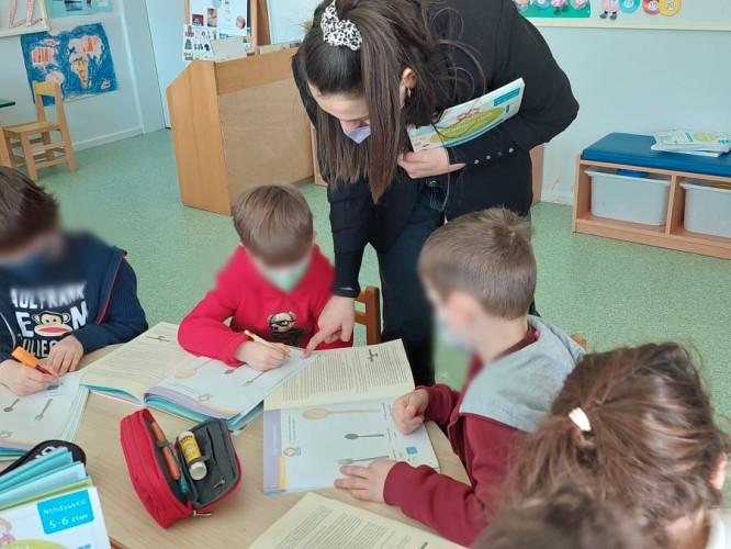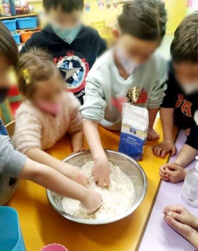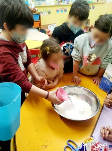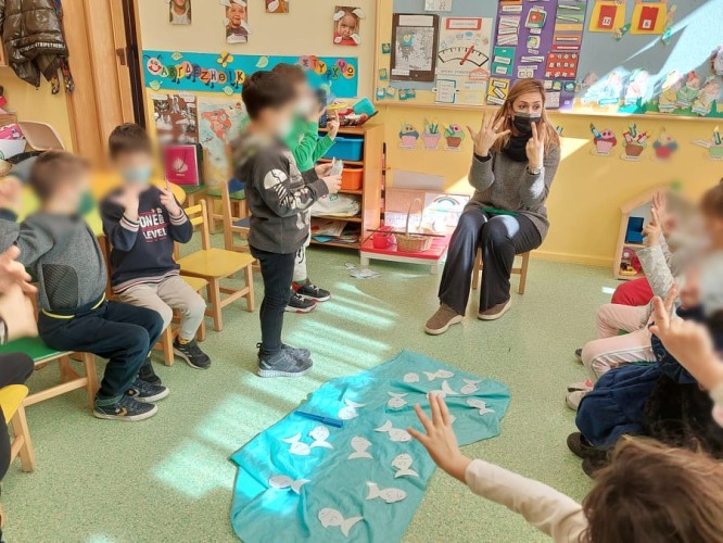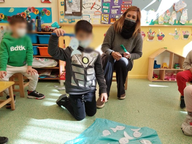 - Έκαναν μαθηματικές πράξεις με τον παραδοσιακό, αλλά και μ’ έναν «φυσικό» τρόπο: Η λιμνοθάλασσα στρώθηκε καταμεσής της τάξης, τα ψαράκια με τους συνδετήρες που είχαν πάνω τους αριθμούς «ρίχτηκαν» στο νερό και το κάθε νηπιάκι πήρε το καλάμι του και ψάρεψε όσα ψαράκια μπορούσε προσθέτοντας τον αριθμό που είχε επάνω το κάθε ψάρι. Μετά, επέστρεφε το ψαράκι στο φυσικό του περιβάλλον.