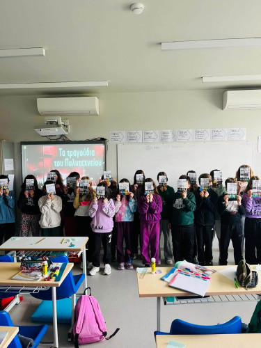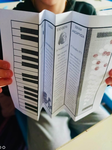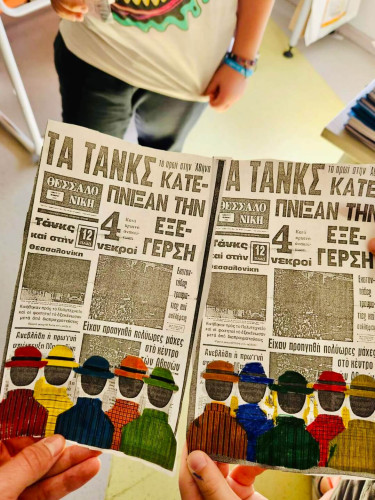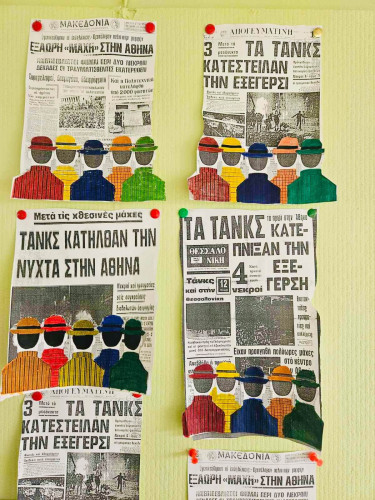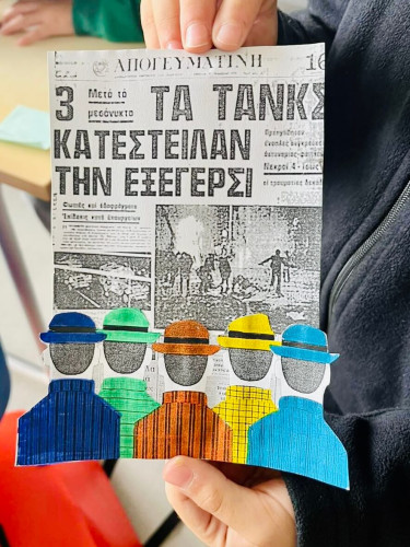 17 Νοεμβρίου 2025Οι μαθητές μας της Ε΄τάξης άρχισαν να ξεφυλλίζουν τα πρωτοσέλιδα των εφημερίδων που αποτυπώνουν ακόμα τα γεγονότα που σημειώθηκαν τις πρώτες πρωινές ώρες, της 17 Νοεμβρίου 1973. «Τα τανκς κατέστειλαν την εξέγερση», «Τανκς κατήλθαν τη νύχτα στην Αθήνα», «Εξάωρη μάχη στην Αθήνα» είναι κάποιοι από τους τίτλους που παρουσιάζουν τι συνέβη πραγματικά εκείνες τις ημέρες στην Αθήνα και όχι μόνο. Στη συνέχεια, συνδυάζοντας τις πληροφορίες που έμαθαν με τον πίνακα του Γιάννη Γαϊτη «Λαθραναγνώστες» τα παιδιά πέρασαν το δικό τους μήνυμα της ανάγκης για φωνή και ελευθερία εκείνη την εποχή. Μέσα από δραστηριότητες αντιλήφθηκαν καλύτερα τη σημασία λέξεων σχετικών με την ημέρα του Πολυτεχνείου, ενώ άκουσαν και τραγούδια γραμμένα στη μνήμη όσων έδωσαν τη ζωή τους για την πτώση της δικτατορίας.