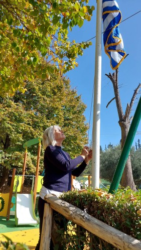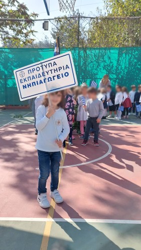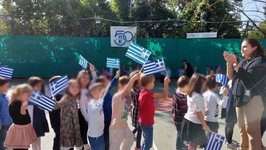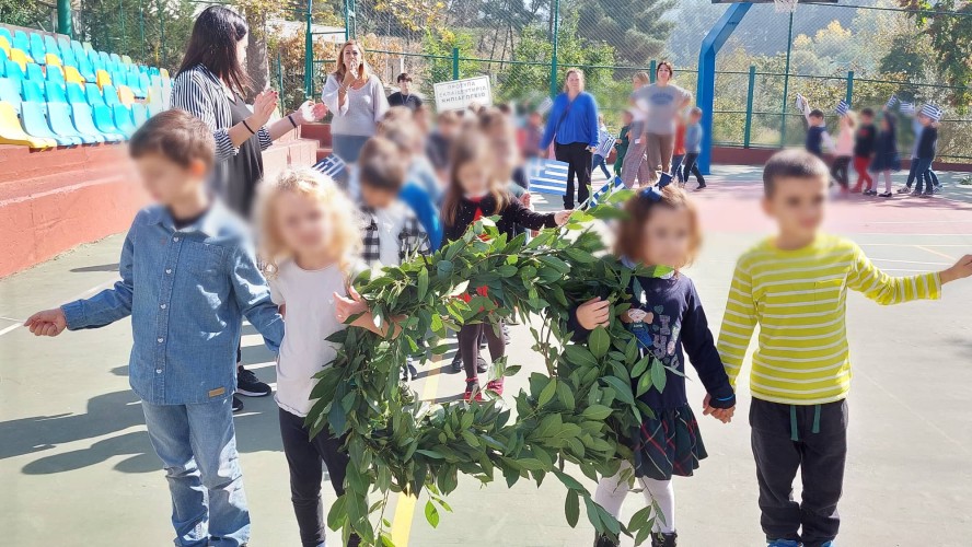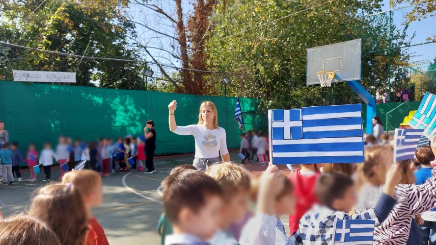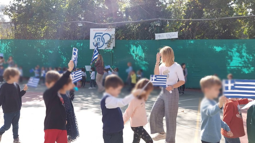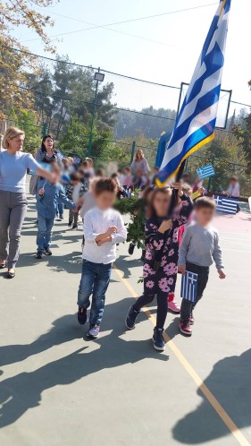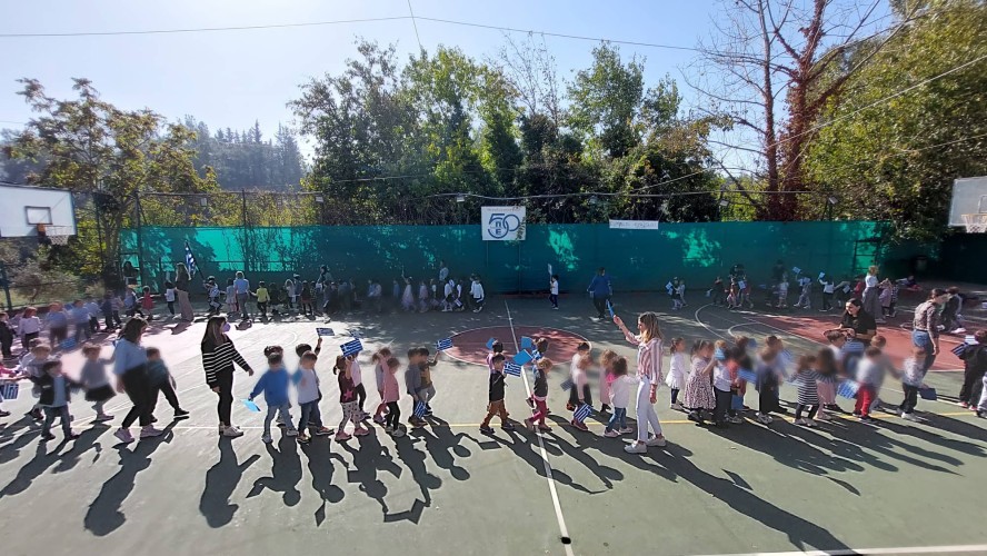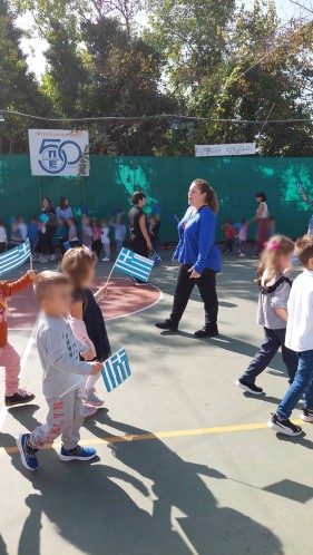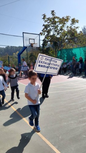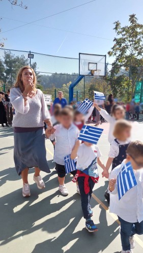 Επίσης, και τα παιδιά μας έκαναν παρέλαση στο γήπεδο μπάσκετ, ενώ σιγοτραγούδησαν τον εθνικό μας ύμνο, τη στιγμή που η διευθύντρια του Νηπιαγωγείου μας πραγματοποιούσε έπαρση της σημαίας.