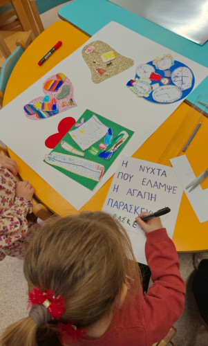 12 Δεκεμβρίου 2025Τι διαφορές έχουν τα παιχνίδια του χθες και του σήμερα; Πόσο θα αλλάξουν στο μέλλον; Aπό τη Δευτέρα 1 έως την Παρασκευή 12 Δεκεμβρίου τα προνηπιάκια μας μέσα από οπτικοακουστικό υλικό γνώρισαν παιχνίδια διαφορετικών εποχών, ενώ αναλαμβάνοντας το ρόλο του «δημοσιογράφου» πήραν συνέντευξη από τους γονείς τους συλλέγοντας πληροφορίες για εκείνα που είχαν στη δίκης τους παιδική ηλικία. Περνά-περνά η μέλισσα, γύρω-γύρω όλοι, τυφλόμυγα, το μαντηλάκι, κουτσό, λάστιχο και σχοινάκι ήταν η ψυχαγωγία των μικρών τα παλαιότερα χρόνια και διατηρείται μέχρι και σήμερα. Παράλληλα, στο πλαίσιο προετοιμασίας της χριστουγεννιάτικης γιορτής τους, τα παιδιά έζησαν όλα τα στάδια δημιουργίας μιας θεατρικής παράστασης: από την κατασκευή σκηνικών και την παραγγελία κοστουμιών μέχρι τη λειτουργία των παρασκηνίων και τη σχεδίαση της δικής τους μοναδικής αφίσας-πρόσκλησης.
