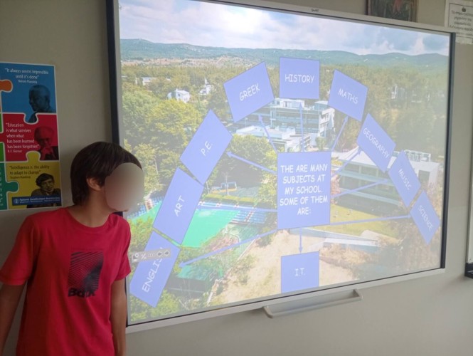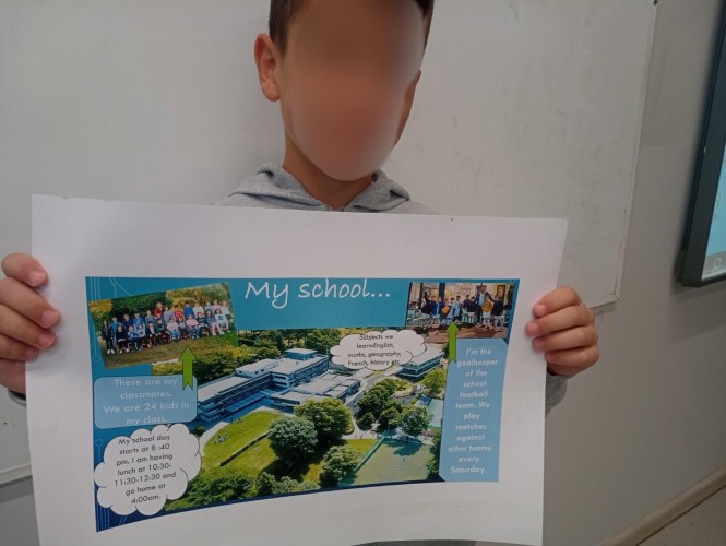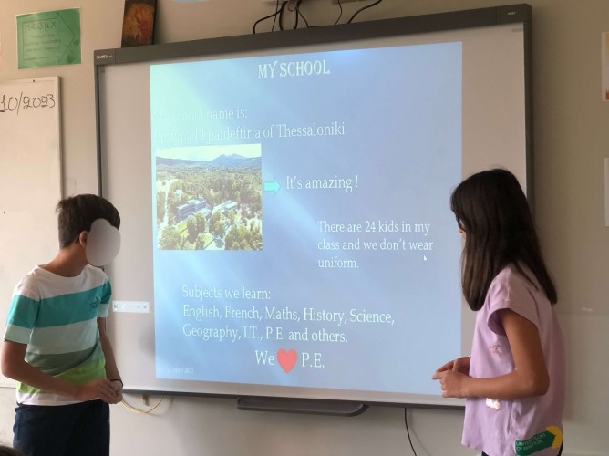 18 Οκτωβρίου 2023Την Τετάρτη 4 Οκτωβρίου τα παιδιά μας της Ε΄ τάξης, στο πλαίσιο του μαθήματος των Αγγλικών, παρουσίασαν το σχολείο τους. Μίλησαν για το αγαπημένο τους μάθημα, για το ωρολόγιο πρόγραμμα, για τα τμήματα δημιουργικής απασχόλησης και για τα διαλείμματα. Η τάξη γέμισε με όμορφες εικόνες των Προτύπων Εκπαιδευτηρίων Θεσσαλονίκης που οι μαθητές μας βρήκαν στο διαδίκτυο ή ζωγράφισαν. Μέσα από όσα είπαν και έδειξαν έγινε εμφανές ότι οι εργασίες τους δημιουργήθηκαν με ενθουσιασμό, μεράκι και πολλή αγάπη για το σχολείο τους.