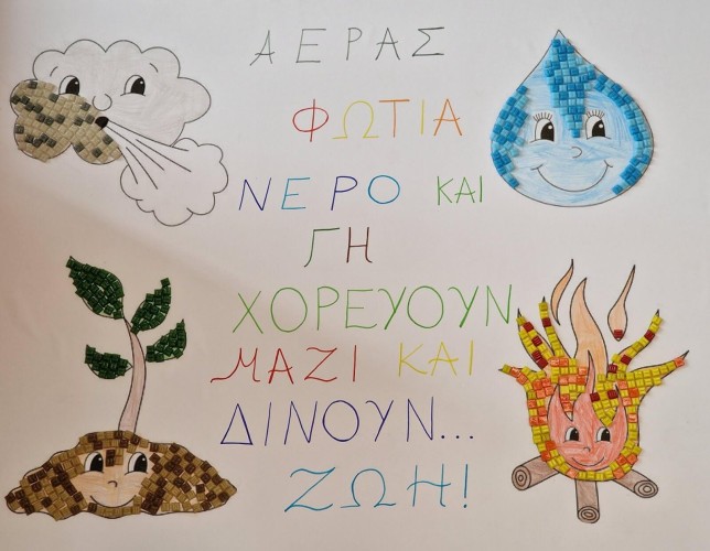 Χρωμάτισαν ομαδικά τον αέρα, τη γη, τη φωτιά και το νερό και, στη συνέχεια, ολοκλήρωσαν την εργασία τους, χρησιμοποιώντας την τέχνη του ψηφιδωτού.