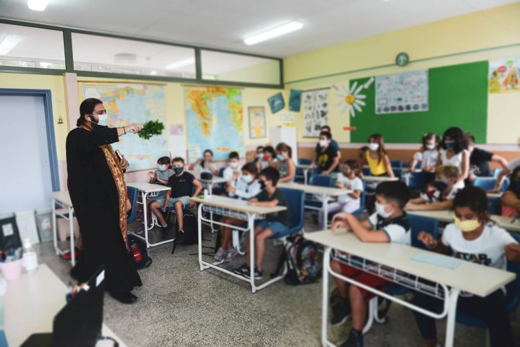 Αργότερα, στον καθιερωμένο αγιασμό που έγινε στον αυλόγυρο του κεντρικού κτηρίου μας παρέστησαν, όπως προστάζουν οι νέες συνθήκες, για λόγους ασφαλείας, λίγοι μαθητές τηρώντας αποστάσεις και φορώντας τις απαραίτητες προστατευτικές μάσκες, ενώ τα υπόλοιπα παιδιά δέχτηκαν το άγιο ράντισμα στις αίθουσές τους.