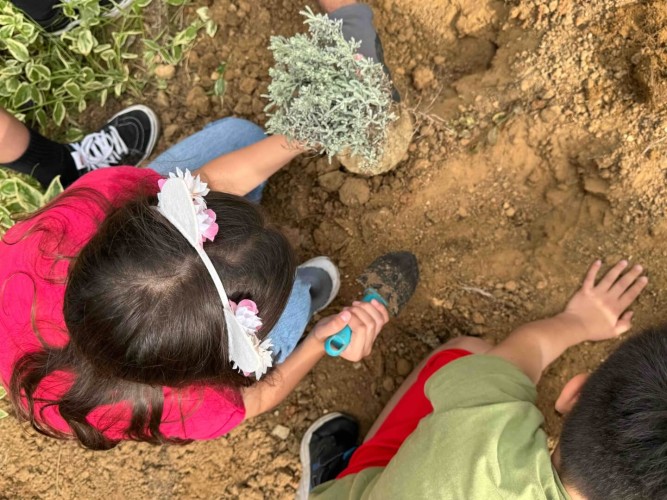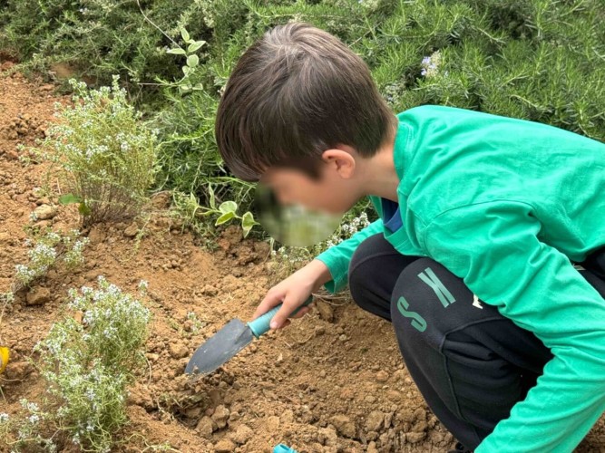 Τα μικρά μας του Νηπιαγωγείου και οι μαθητές των Α΄, Β΄ και Γ΄ τάξεων φύτεψαν μεσογειακούς σπόρους, βολβούς και λουλουδάκια της εποχής στην αυλή μας και βίωσαν τη χαρά της φροντίδας του δικού τους φυτού. Τώρα, κατιφέδες, ντάλιες, ζήνιες, πετούνιες, φλογίτσες δίνουν χρώμα και ζωντάνια στην καθημερινότητά μας. Έτσι, τα παιδιά μας συμμετέχουν ενεργά στη διαμόρφωση και τον καλλωπισμό των κήπων του σχολείου μας.