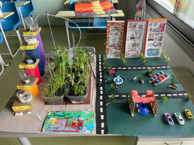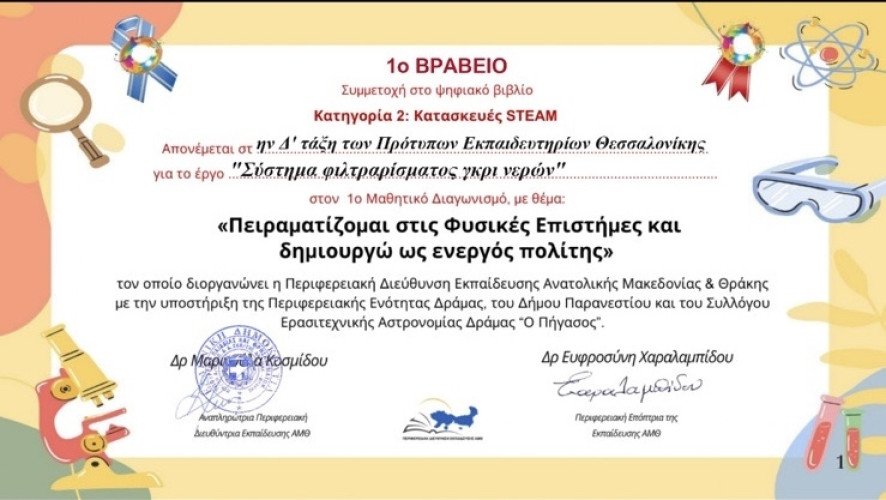 30 Μαΐου 2025Στο πλαίσιο του μαθήματος «Μελέτη Περιβάλλοντος» και των Εργαστηρίων Δεξιοτήτων με θέμα το υπέδαφος οι μαθητές μας της Δ΄ τάξης κατασκεύασαν μια μακέτα που παρουσιάζει ένα σύστημα φιλτραρίσματος και επαναχρησιμοποίησης γκρι νερού, η οποία απέσπασε το πρώτο βραβείο στον 1ο Πανελλήνιο Μαθηματικό Διαγωνισμό «Πειραματίζομαι, Δημιουργώ, Δρω ως ενεργός Πολίτης». Η μακέτα που δημιούργησαν παρουσιάζει ένα σύστημα καθαρισμού και εκ νέου χρήσης γκρι νερού. Αφορμή για την κατασκευή αποτέλεσε η συζήτηση σχετικά με τη σπατάλη νερού και η ανάγκη για βιώσιμες λύσεις διαχείρισης. Η πρόταση των παιδιών μας στοχεύει στην αξιοποίηση του χρησιμοποιημένου νερού από οικιακές δραστηριότητες, το οποίο μέσω κατάλληλου φιλτραρίσματος μπορούμε να εκμεταλλευτούμε για άρδευση καλλιεργειών, πλύσιμο οχημάτων ή για την παροχή νερού σε δημόσιους χώρους, όπως στα πάρκα και τις πλατείες. Με αυτόν τον τρόπο ενισχύεται η περιβαλλοντική συνείδηση και προωθείται η ορθολογική διαχείριση των υδάτινων πόρων.